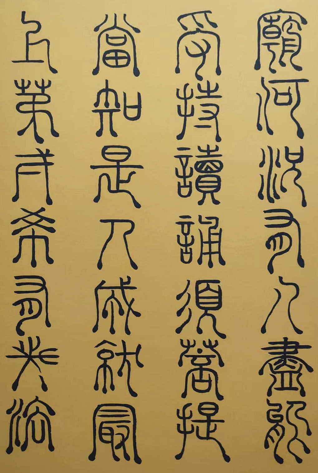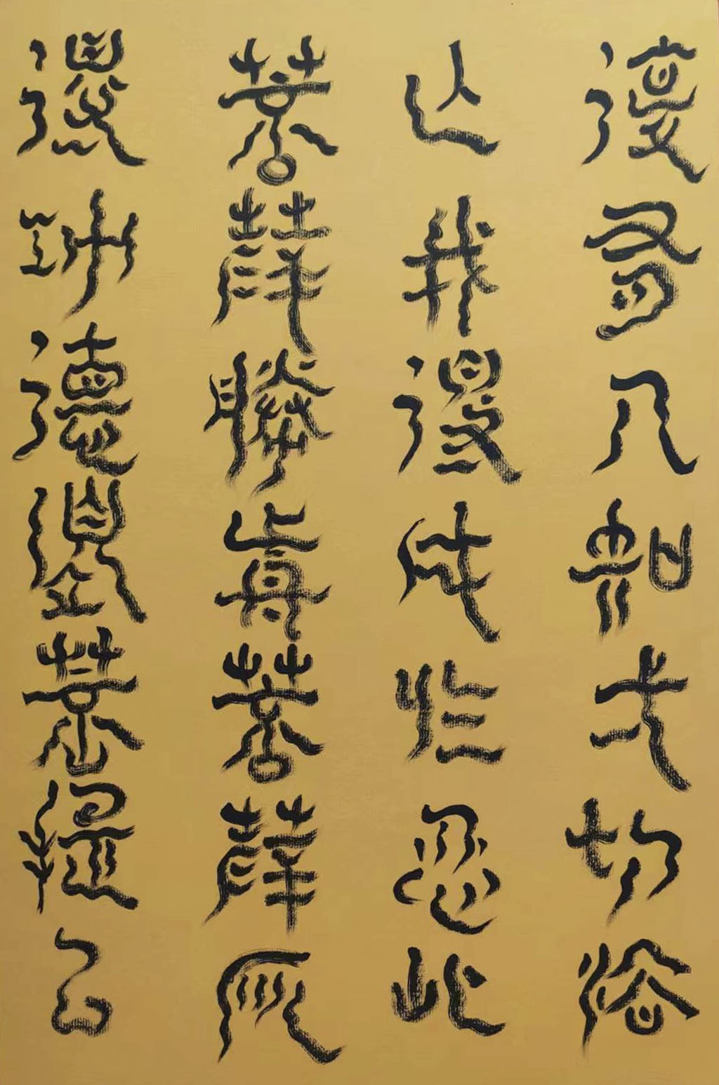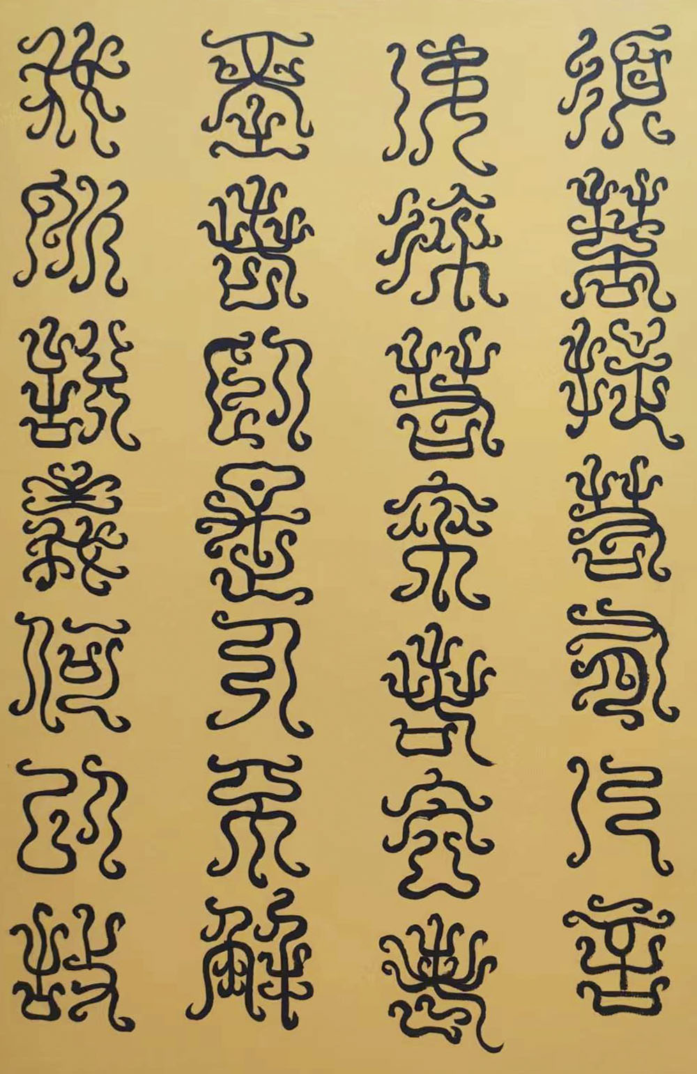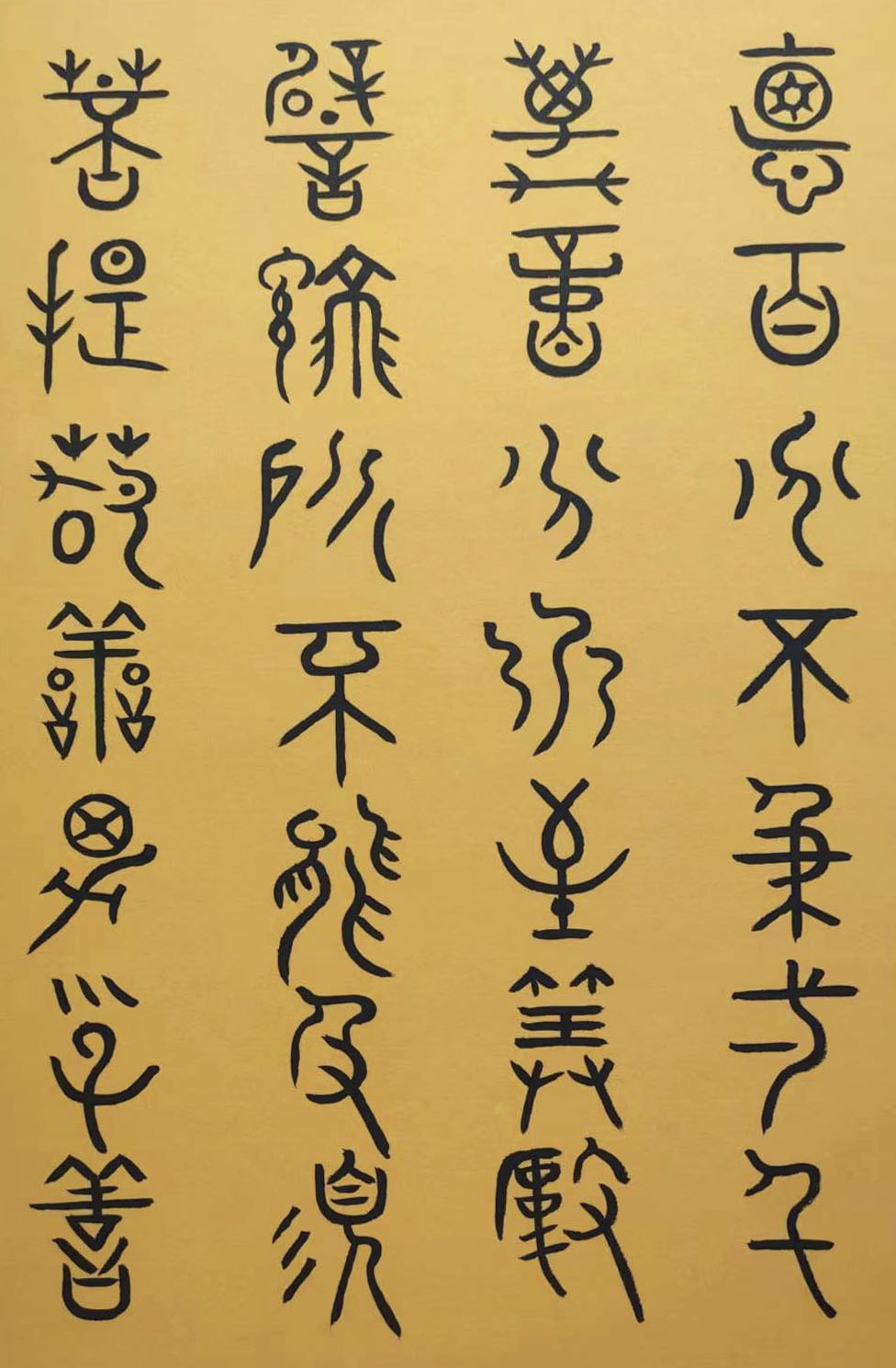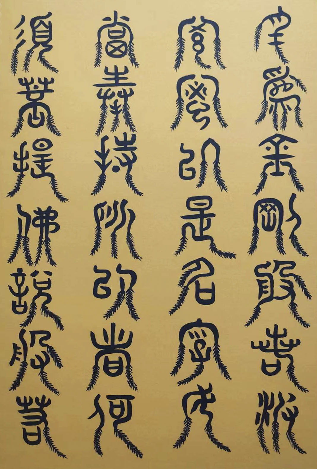 各类篆书之所常见,泰山碑为代表的官家气象,峄山碑所代表的秦风铁丝。再向远溯,则有石鼓文勒石朴茂的风范,亦有金文叩击山河的变化多端。但是,这些大篆类小篆书类的书法现象,却不能完全表现书法文化在秦以及先秦时代的百花齐放。走进当代著名书法家韩学友先生的书法体系,足以极视听之愉,可以大览篆书源头的无量奇观!他以书法家的历练,深刻挖掘篆书的三十二体的写法秘籍,以亘古相续的文化弘扬姿态,把篆书宏伟博大的历史奇观,在当下焕发出夏鼎商彝式的巍巍精神!