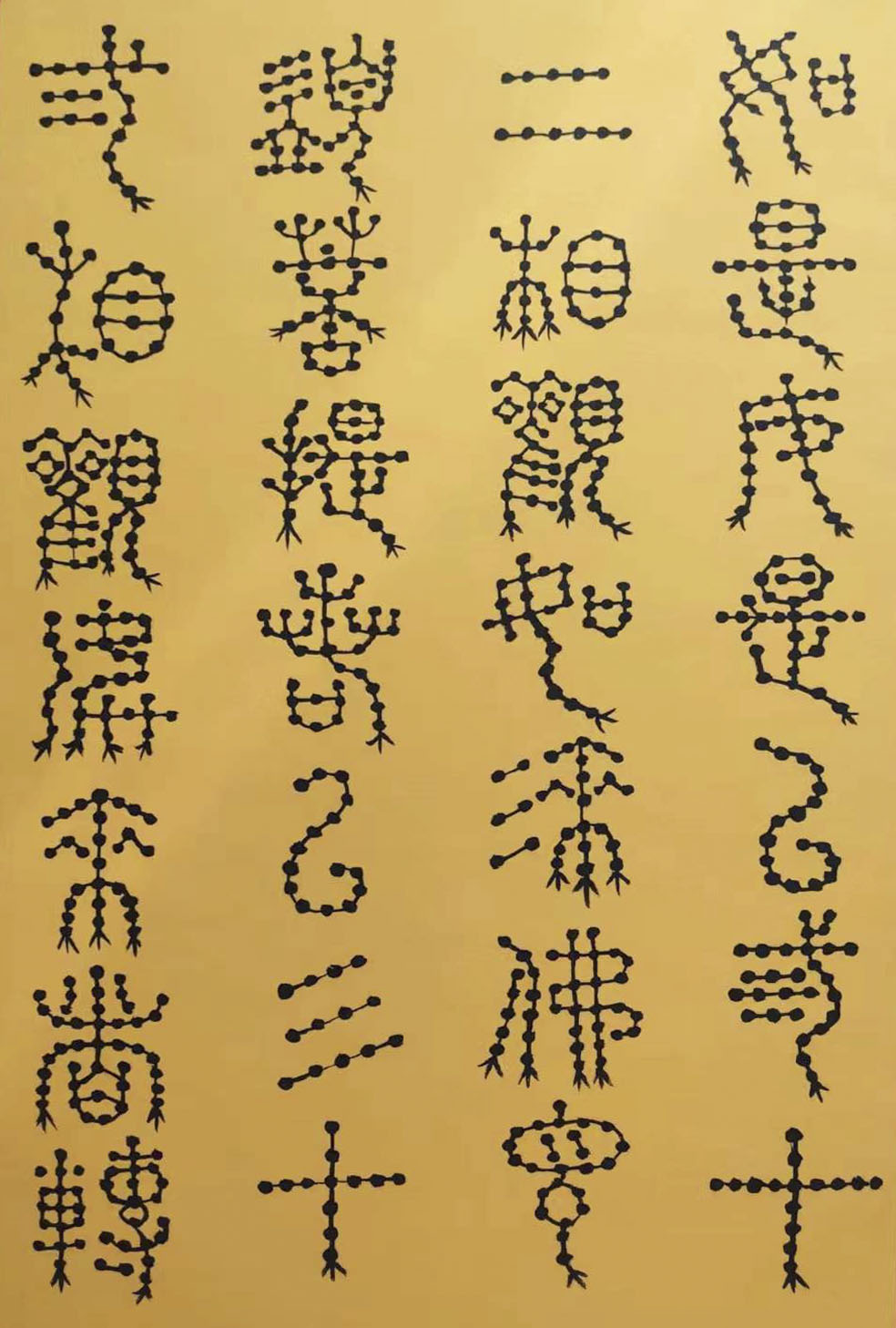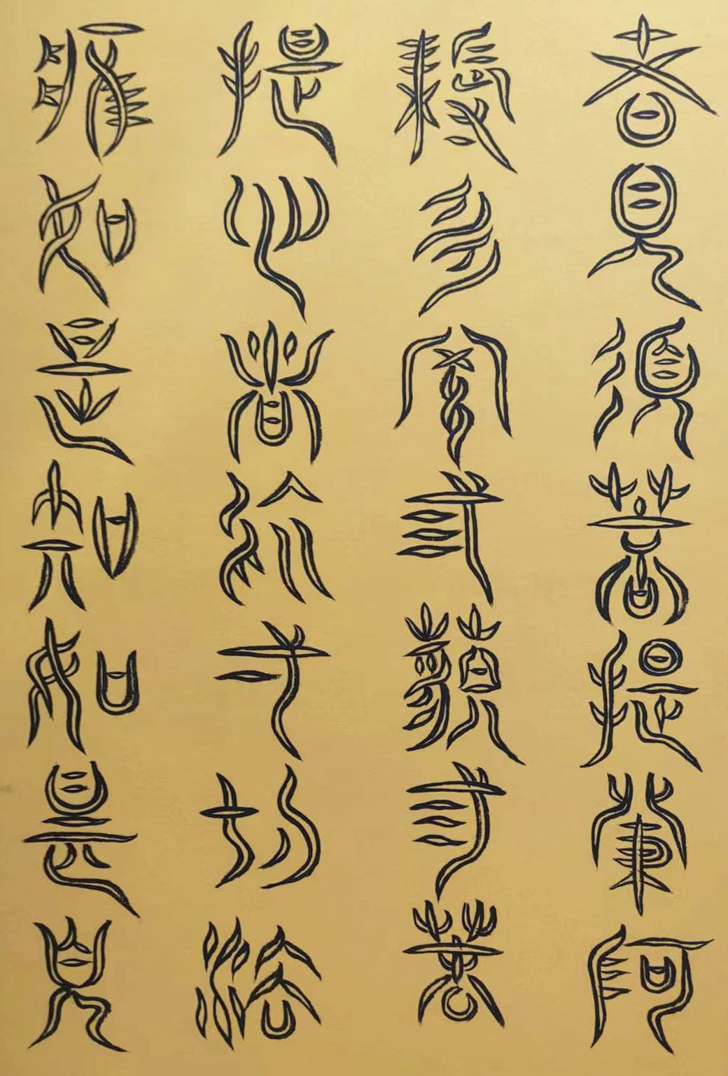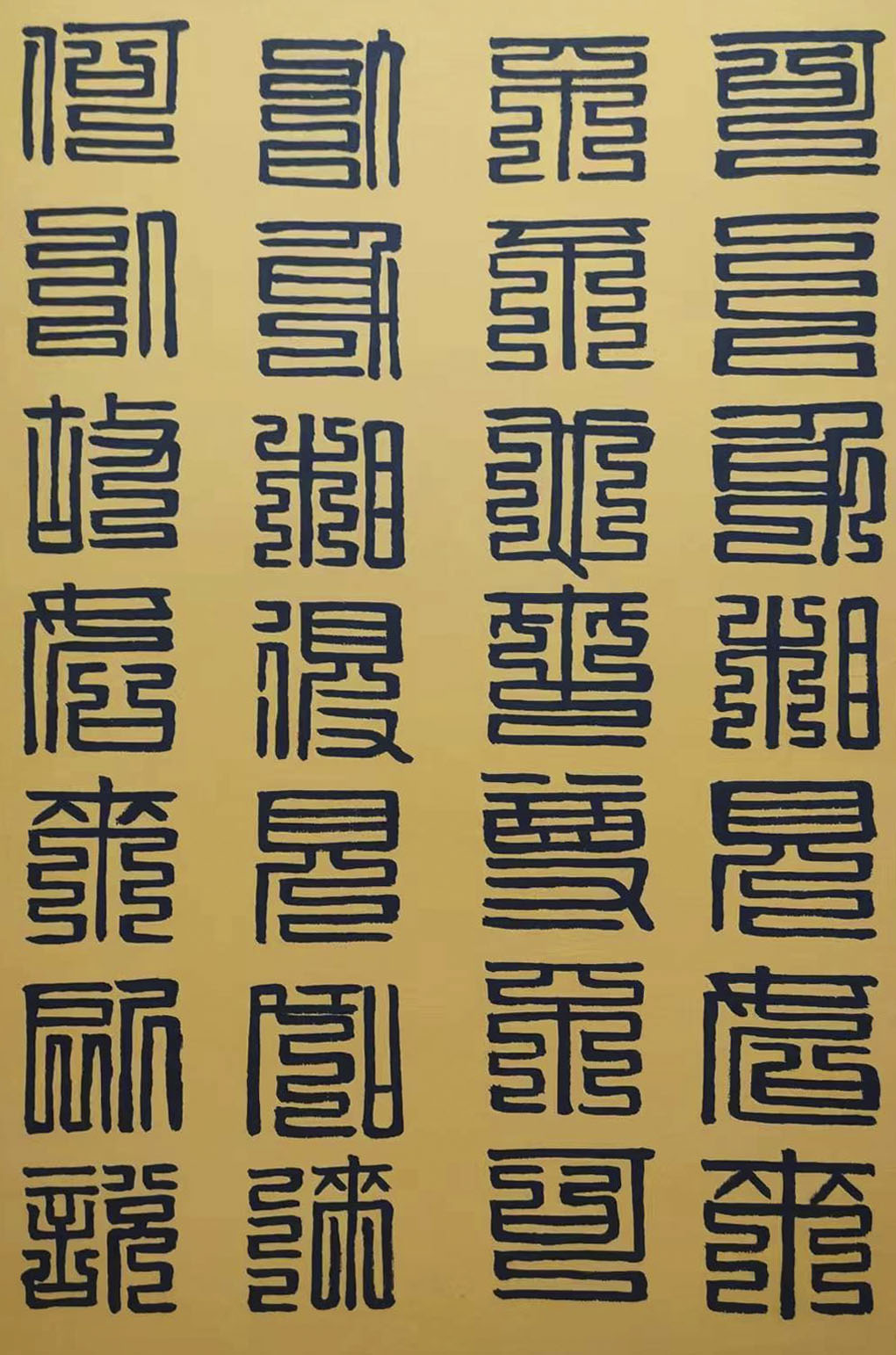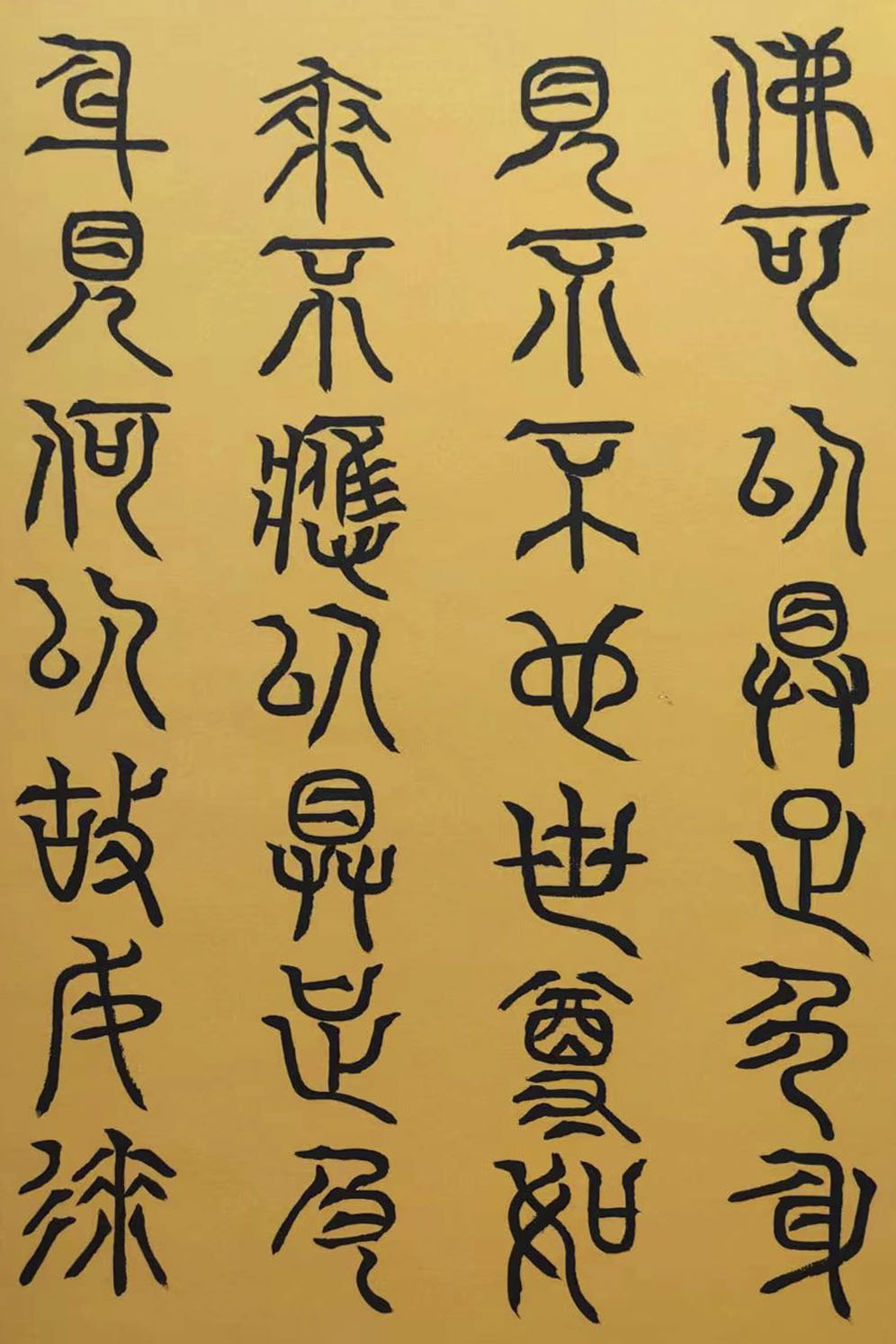 各类篆书之所常见,泰山碑为代表的官家气象,峄山碑所代表的秦风铁丝。再向远溯,则有石鼓文勒石朴茂的风范,亦有金文叩击山河的变化多端。但是,这些大篆类小篆书类的书法现象,却不能完全表现书法文化在秦以及先秦时代的百花齐放。走进当代著名书法家韩学友先生的书法体系,足以极视听之愉,可以大览篆书源头的无量奇观!他以书法家的历练,深刻挖掘篆书的三十二体的写法秘籍,以亘古相续的文化弘扬姿态,把篆书宏伟博大的历史奇观,在当下焕发出夏鼎商彝式的巍巍精神!