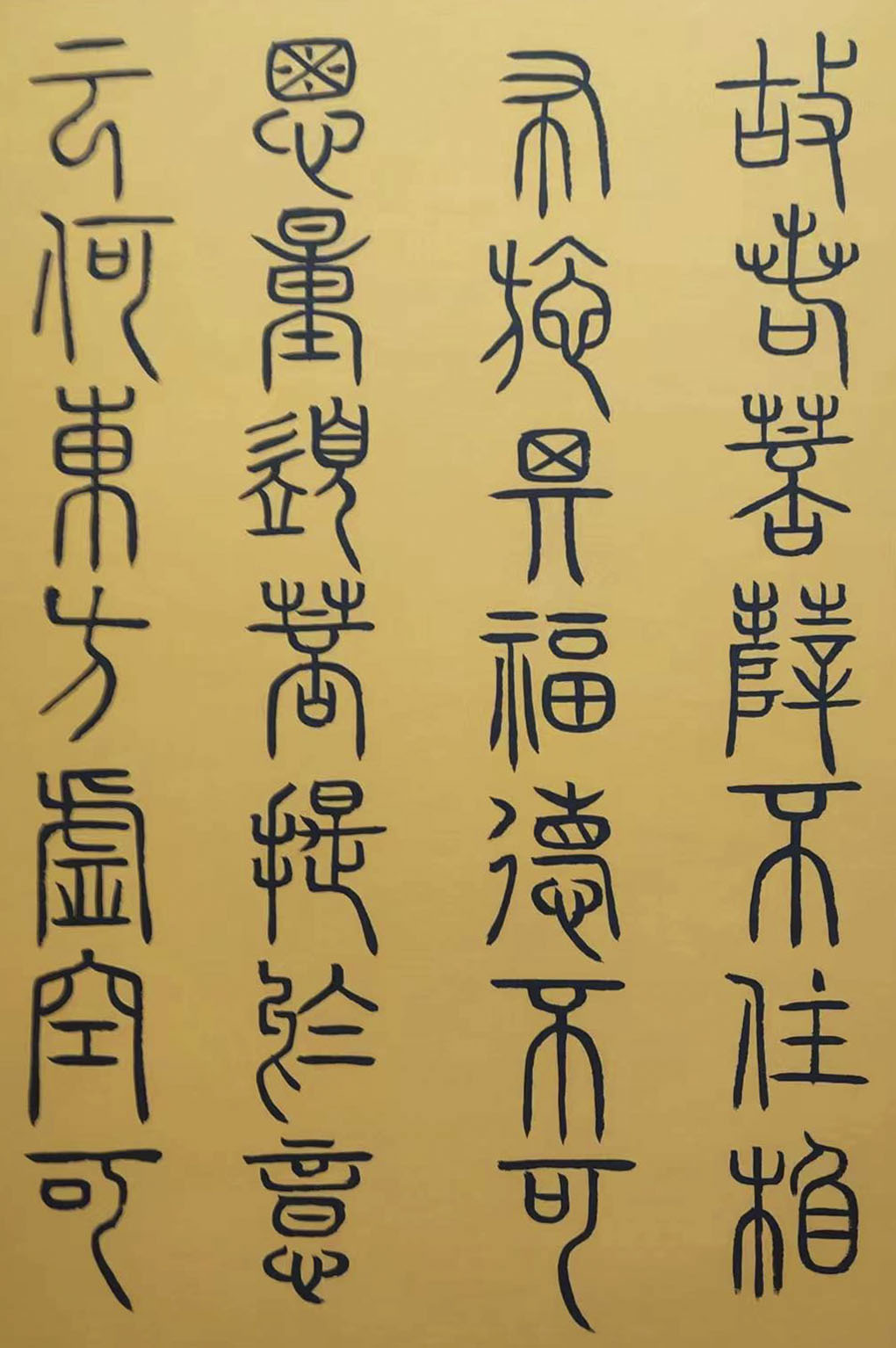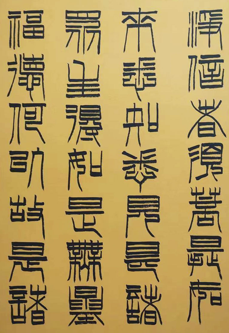 纵观先生的众幅佳作,其作中篆体无不是存朴卓于婉转,具高雅于自然,渊博学养亦是有存乎于字势之间,是可纵以畅达格调,更可置以高古正典!文人情怀,以书载道,不激不厉,风韵独彰!所行篆体皆是有研于碑法,亦有感于范论,是于古篆中汲取养分,更于今时中契合笔意,相参相融,继索升华,厚积而薄发!在一幅作品的统观表现上,是可见于气势之磅礴,也可见于沉稳之雅流,笔调之间更是不作以任何的矫揉唐突之势,而是行笔开合有度,运笔气意并存,笔线大小长短皆是如此!