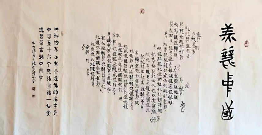 源于传承,善于领悟,其主要作品有,道德经、三字经、千字文、弟子规、兰亭序、唐诗宋词;在内容意境中糅和书法精神,并通过线条与布局,巧妙地解读书法的文化内涵,行笔自然真淳,气象多元,有雅有拙。作品因意境涵义而多变,有长城型、葫芦形、蝴蝶型、地图形、宝塔型、心型等等,表现出对传统文化的追求与个性新意的创造,作品中展现出创造的形态美和意境美。多次参加公益活动,深受欢迎,许多作品被企业家和国际友人收藏。