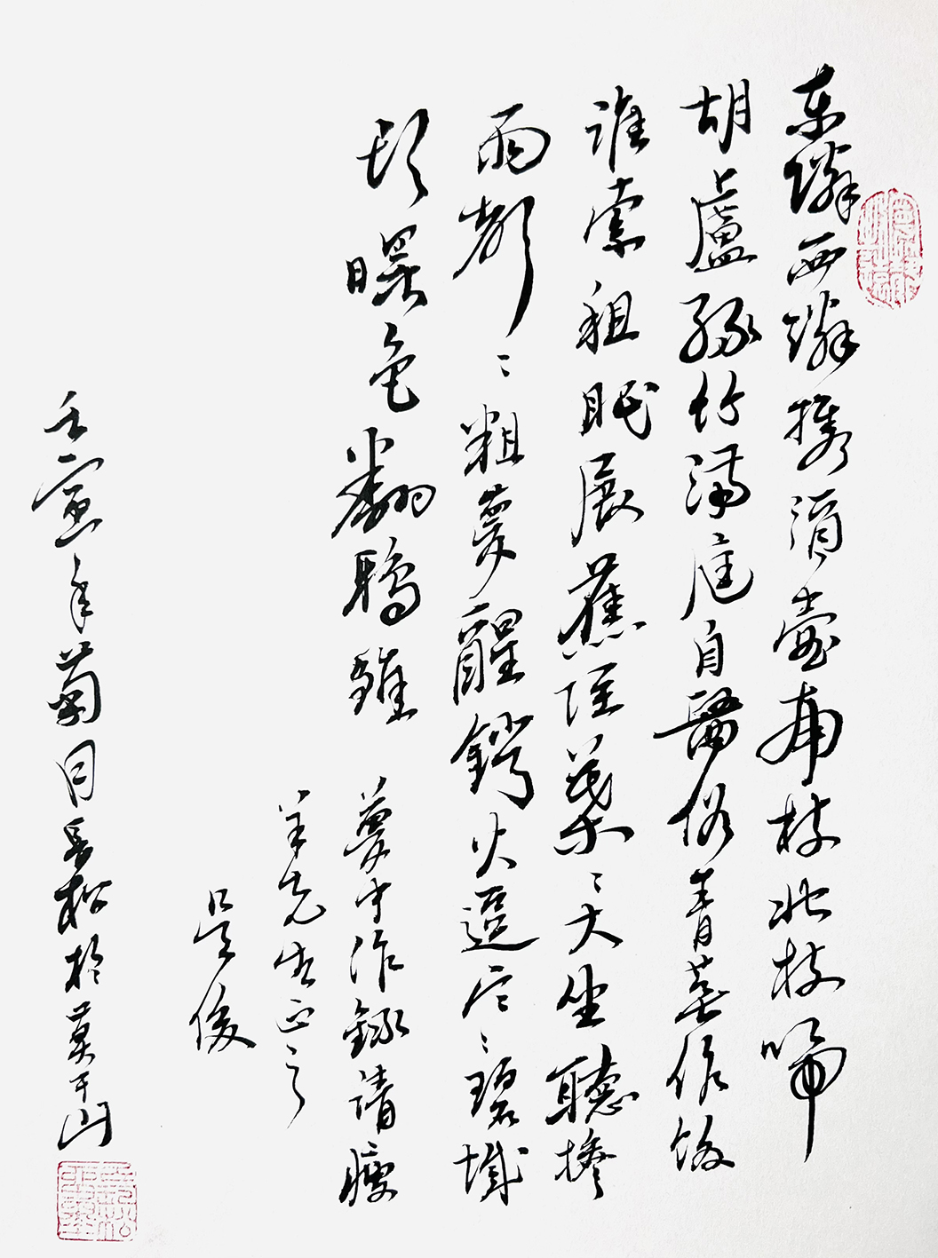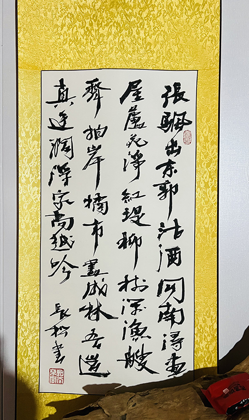 其书法作品苍劲有力、浑厚凝重。其书法线条如云卷云舒,跌宕起伏。其书法用笔独特,裂变爆发。其书法融合了颜、米、王的特点,既宽博开张,又欹侧纵横,生动有致。不媚不俗,傲骨铮铮。寓意深远回味无穷