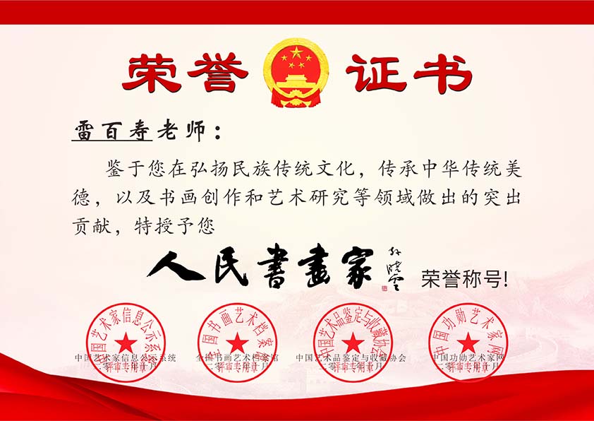 雷百寿,笔名东方龙,人民书画家,中国书画院院士,北京翰林书画院理事,中国国典书画院院士,中国文化魂书画研究院副院长,西安盛唐书画研究院副院长,中旅白鹿原书画院高级顾问,黄河书画院名誉院长。
