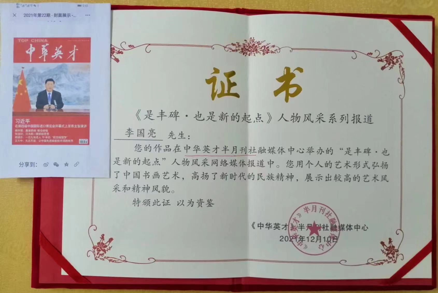 2014年,李国亮的木雕(动画)和电动木雕工艺分别获得外观设计专利和实用新型专利。这之后,李国亮又花了5年时间,升级改造“静态版”的《清明上河图》。今年8月,“动态版”《清明上河图》全部完成。最重要的是,文化是民族的根基,他希望用自己的技艺为文化传承尽一份力,“少年强则国强,我要给孙辈们树立积极向上的价值观与爱国情怀。我的下一个五年计划要完成。唐诗100首、三字经、弟子规的木雕作品。”转载广州日报,韶关日报。作品被邀录入《文化强民族强》主题中国邮册,荣获“2016年度广东省优秀民间文艺家”称号,2020年在中国世纪大采风二十周年庆典暨电视年度人物颁奖盛典活动中,被授予中国当代德艺双馨艺术家荣誉称号。入编《采风中国》书画专刊,献礼建国七十周年,中国新文艺书画工作委员会颁发“最具创作力的书画名家”荣誉证书,同时获得各界人士好评!