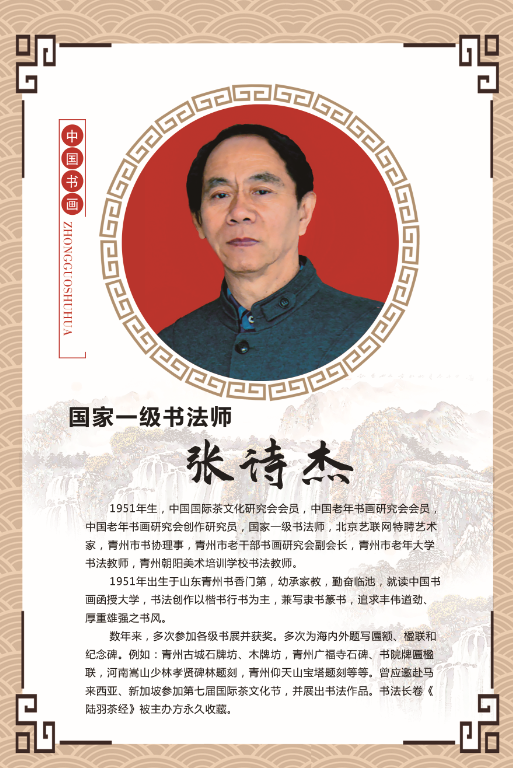 张诗杰,1951年出生于山东青州书香门第,幼承家教,勤奋临池,就读中国书画函授大学,书法创作以楷书行书为主,兼写隶书篆书,追求丰伟遒劲、厚重雄强之书风。