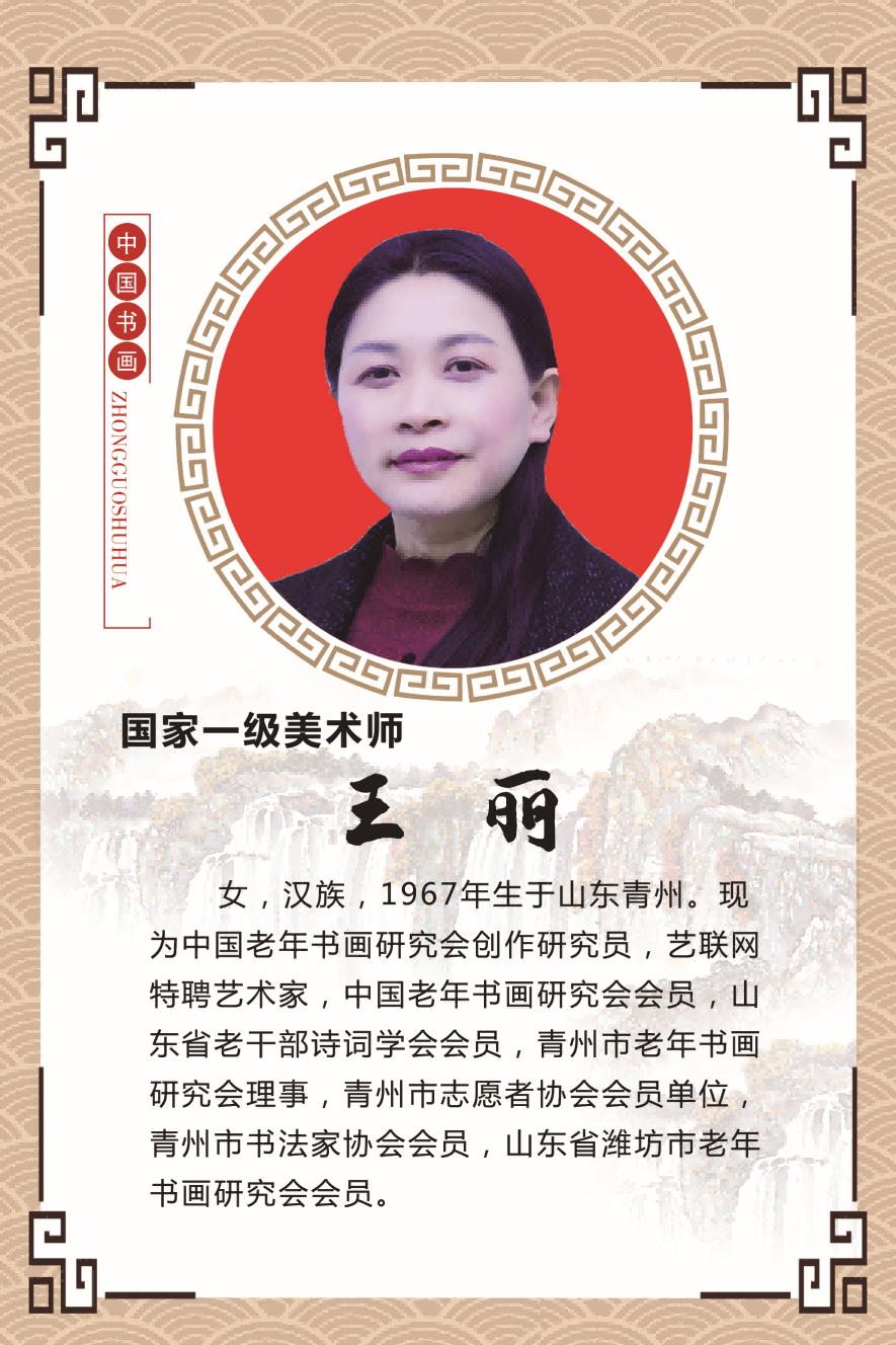 王丽,女,汉族,1967年生于山东青州。退休后,在青州老年大学学习颜楷,师承张诗杰老师。现为国家一级美术师,中国老年书画研究会创作研究员,艺联网特聘艺术家,山东省老干部诗词学会会员,青州市老年、老干部书画研究会理事,青州市志愿者协会会员单位,青州市书法家协会会员,山东省潍坊市老年书画研究会会员。