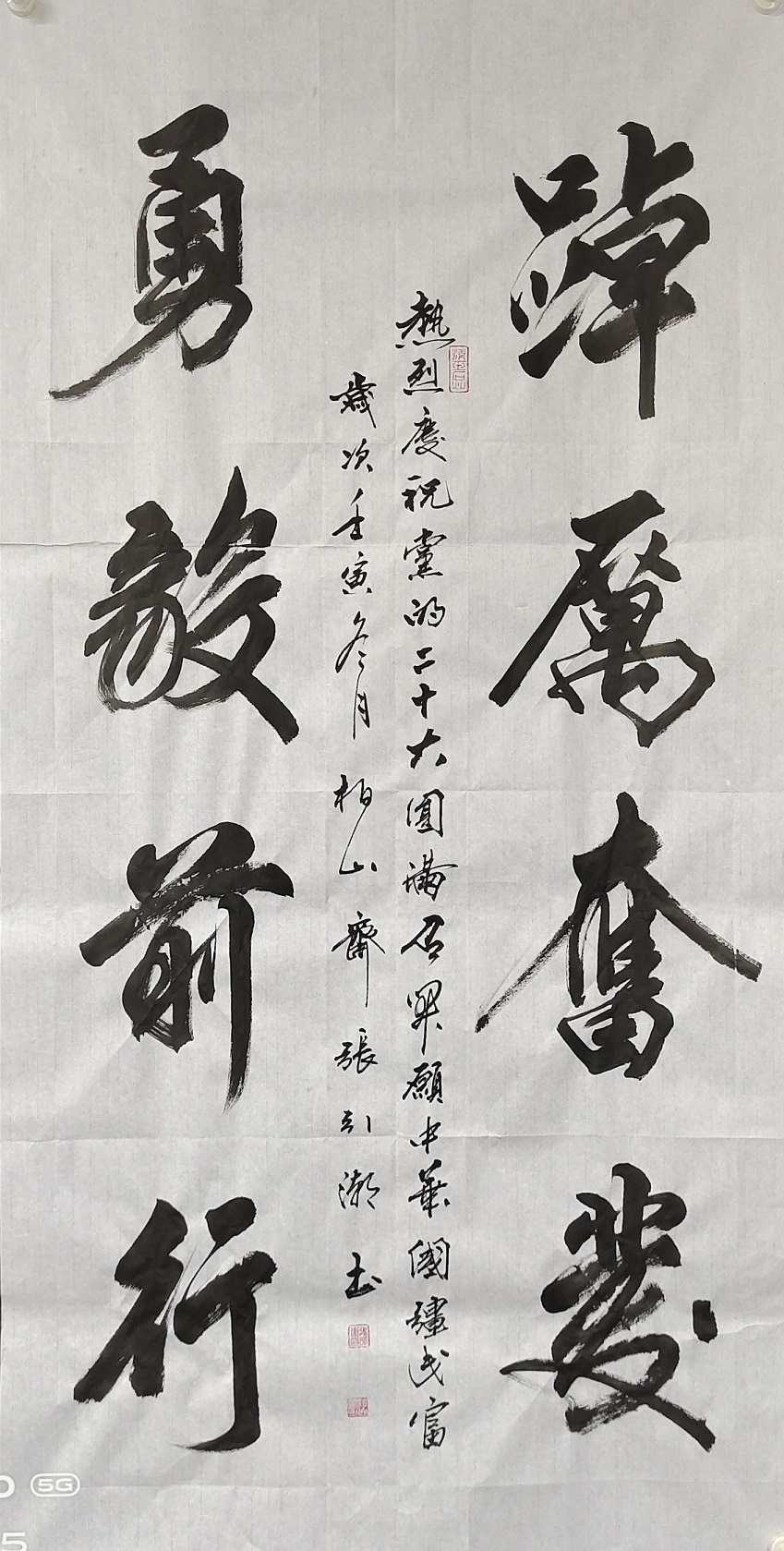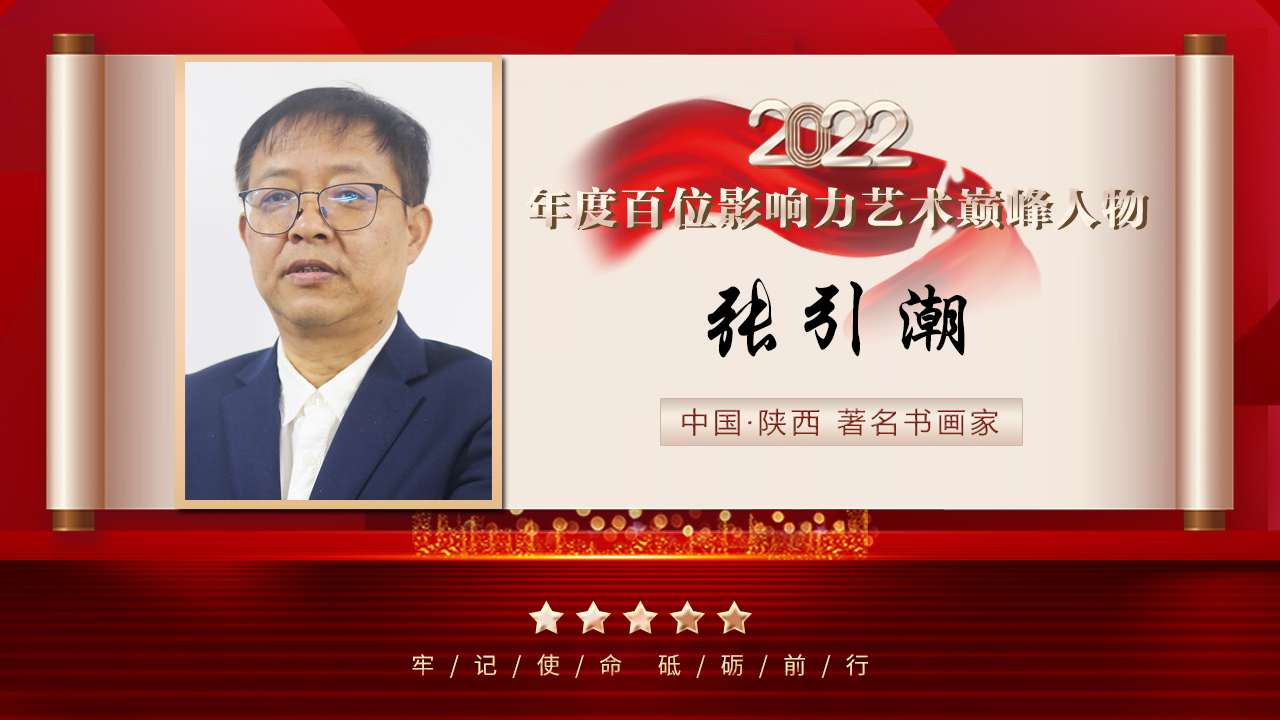 张引潮 柏山斋主人,笔名:潮人。1964年10月出生,陕西省司马迁故里韩城市人。自幼艺术天资浓郁,悟性超常。1986年随古建採画队在西安兴庆宫、太乙宫、翠华山、兴教寺等地採画。坚持几十年每天2至4个小时的苦练基本功,不望名与利,只求有真功夫。陕西省老年书画学会韩城分会会员;2018年全国第四届书画艺术大赛中获得二等奖;在第六届全国职工书画大赛中作品被收藏;2019年经全国主流媒体和专家评审被筛选推荐为中华国礼工艺美术大师和中国杰出艺术家;2020年通过网上评比获得国家一级书法师殊荣,同年在盛世中华杯书画大赛活动中获三等奖;2021年入编权威书画家百科和盛世华章当代艺术名家档案;作品在司马迁故里龙门书画院布展;纪念建党百年华诞被誉为全国艺术楷模称号;评定为中国书画百年巨匠传承人;2022年推荐为中国冬奥会形象大使和中国杰出艺术家,中国发展传承委员会授予最具时代风采现代艺术大家。