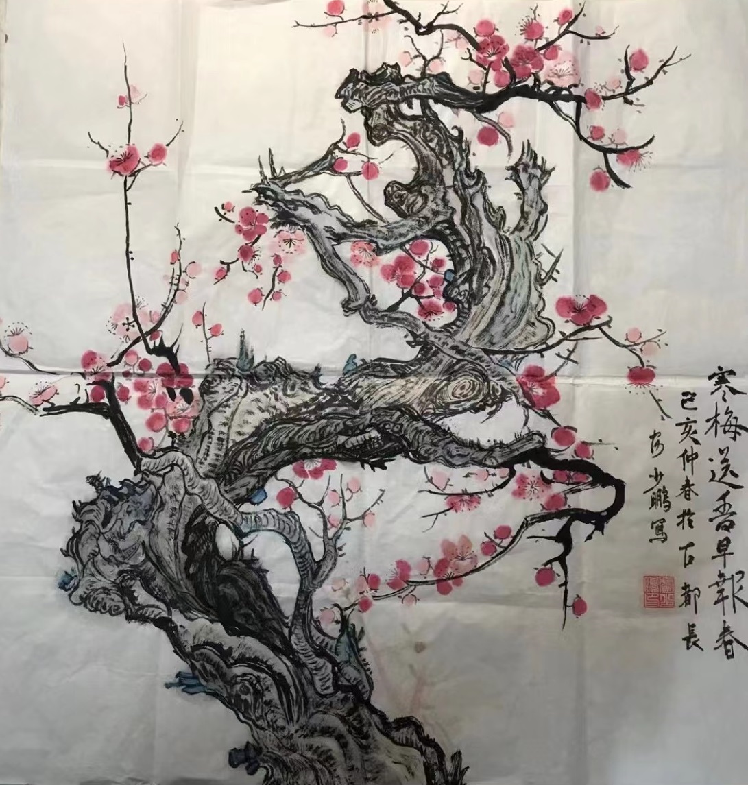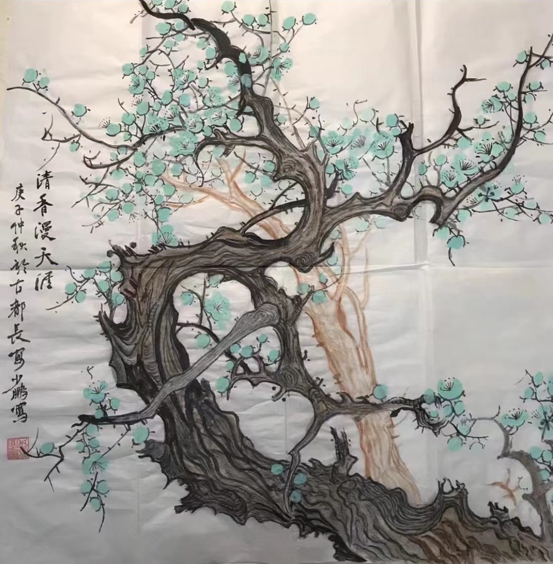 卢少鹏尤其擅长画梅花、山水、花鸟、人物,此外还特别喜欢一篆书创作。为了学习篆书,临摹了自秦代以来篆书的多种写法,并在熟炼掌握的基础上,探索出风格独有的篆书。