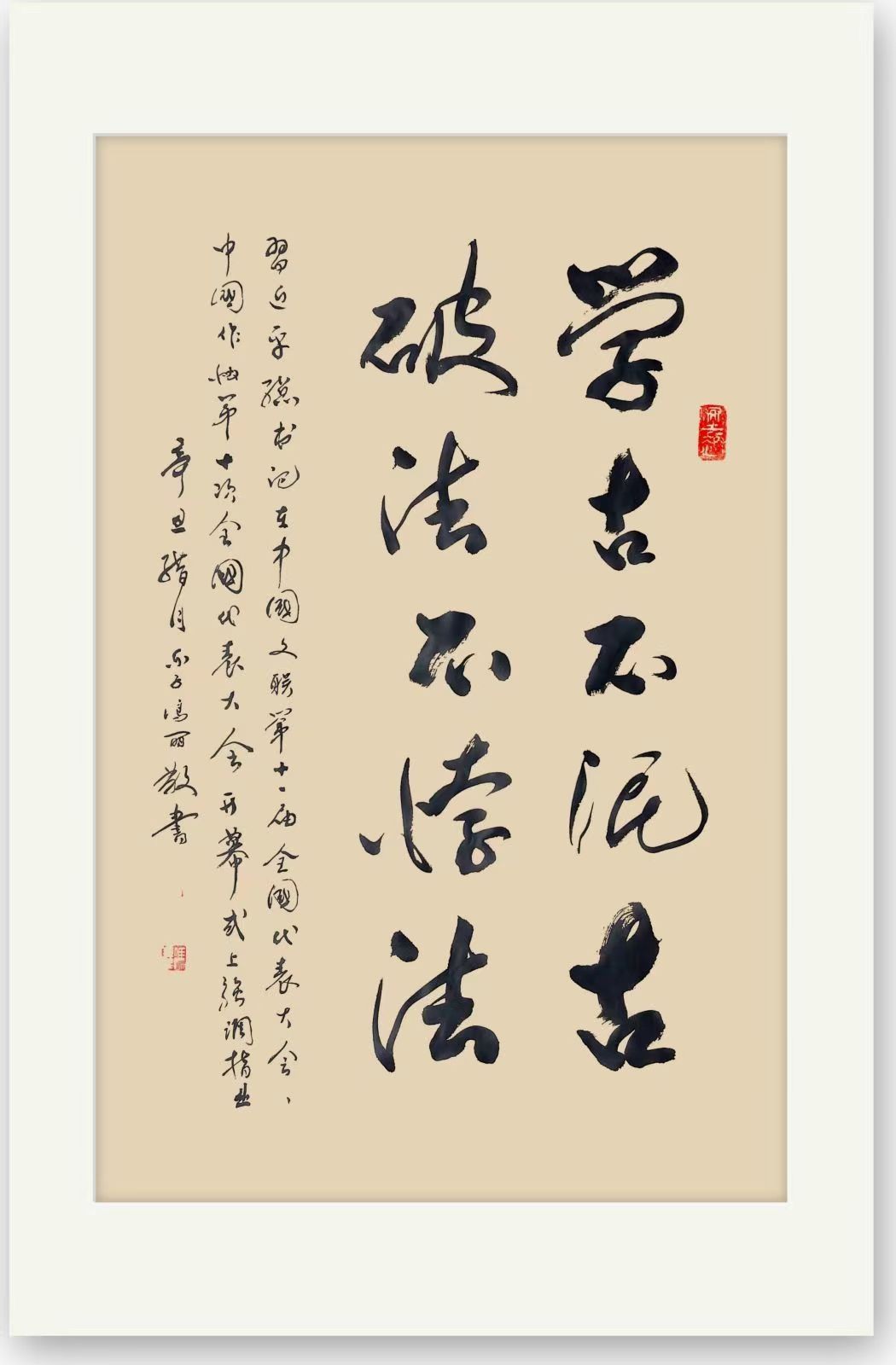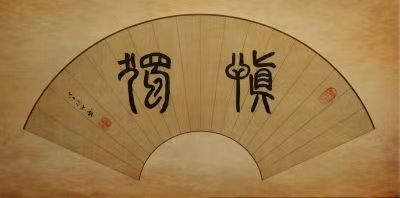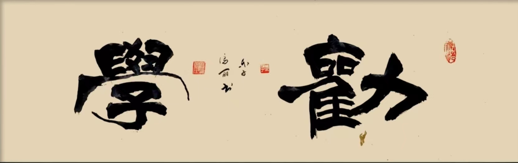 而在篆书作品和隶书作品的创作上,冯女士的书风气概也同样是能够令人为之叹赏!和行草书法不同,其篆书和隶书的取法造诣则是有充分秉持了碑法的高古一脉,篆书结体精到自然,笔墨之迹更是尤为简畅,字字线条可谓尽是能于柔中带刚,篆法格调,老辣娴熟!继观其隶书作品,一幅《劝学》隶书大字,无论是章法之体现,还是结体之雄奇,都是有达到了一种古拙典雅的浑然风范,尤其是那经由笔触和纸面摩擦后所形成的苍感墨迹,更是能让人尤感其碑意之深厚!其势所展,尽显无遗!