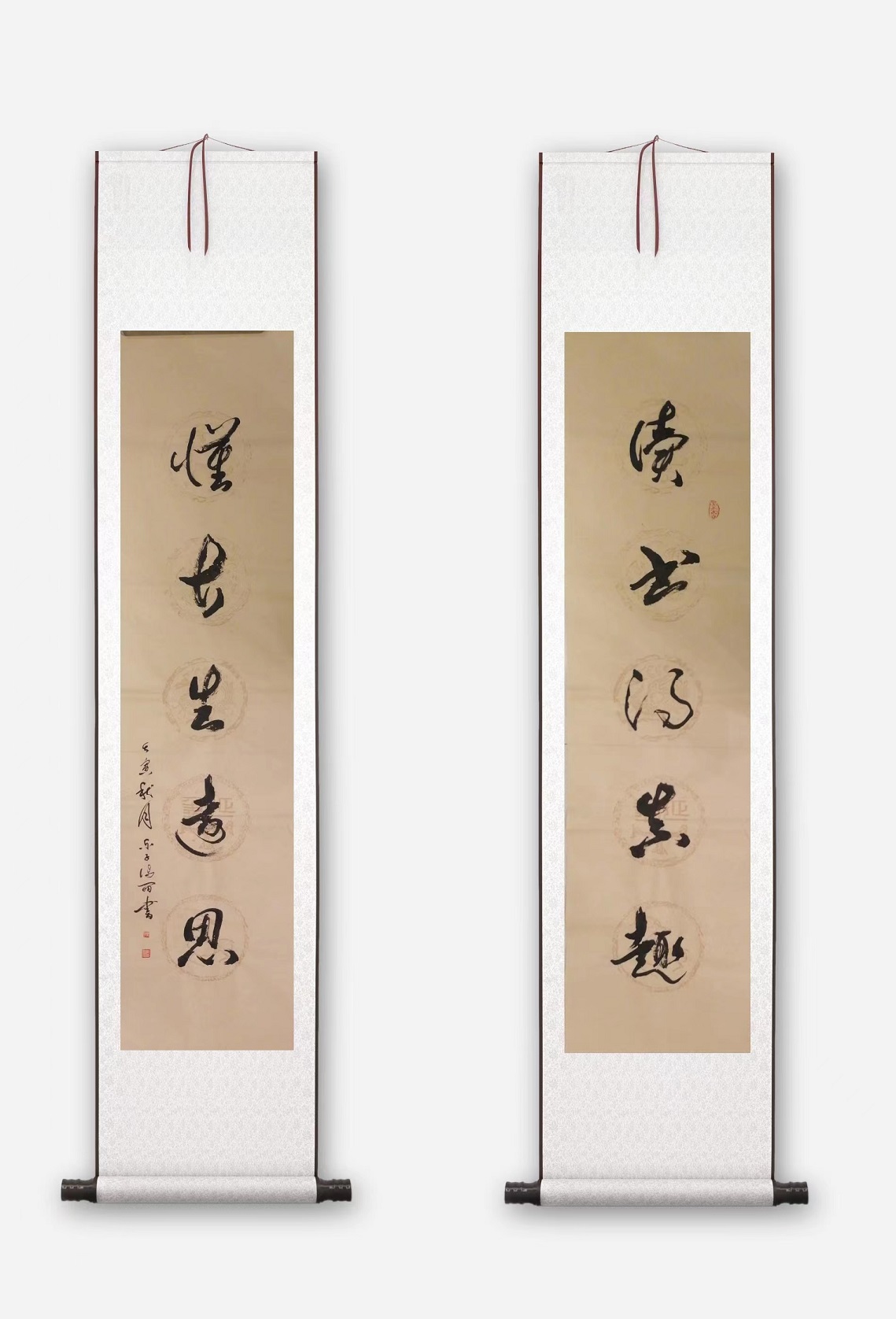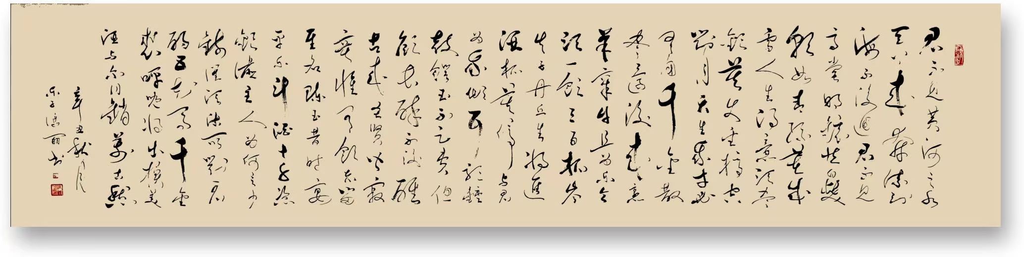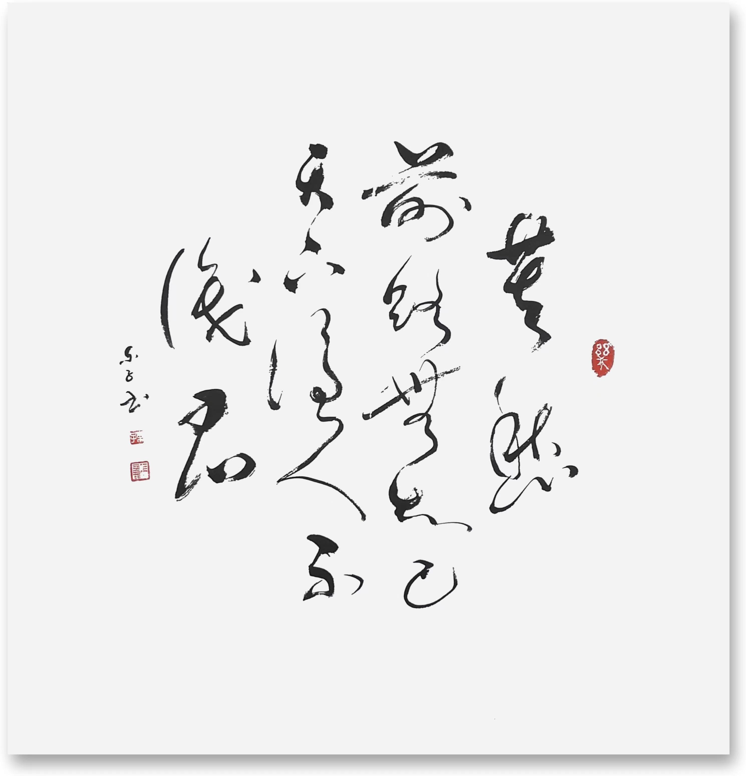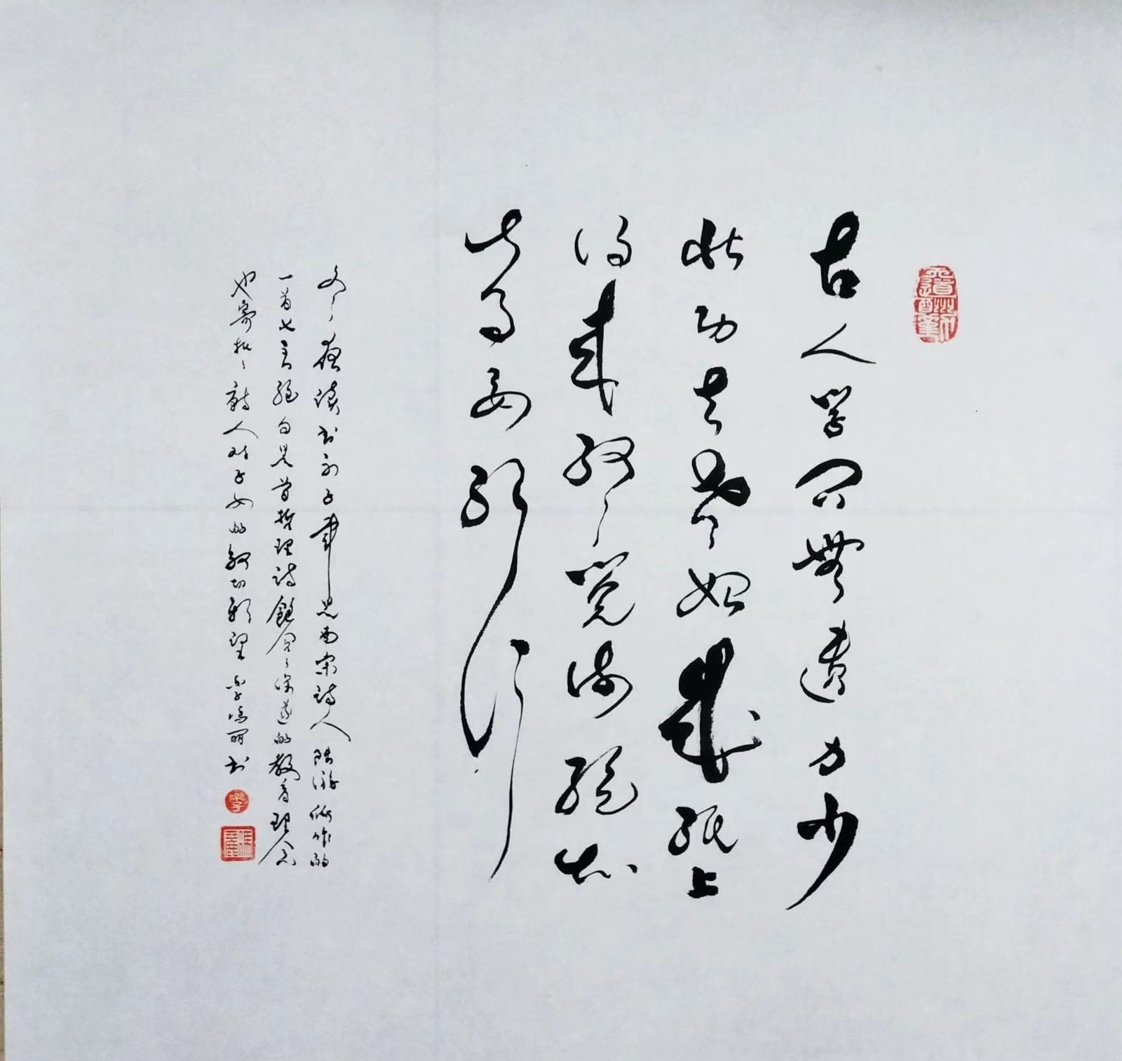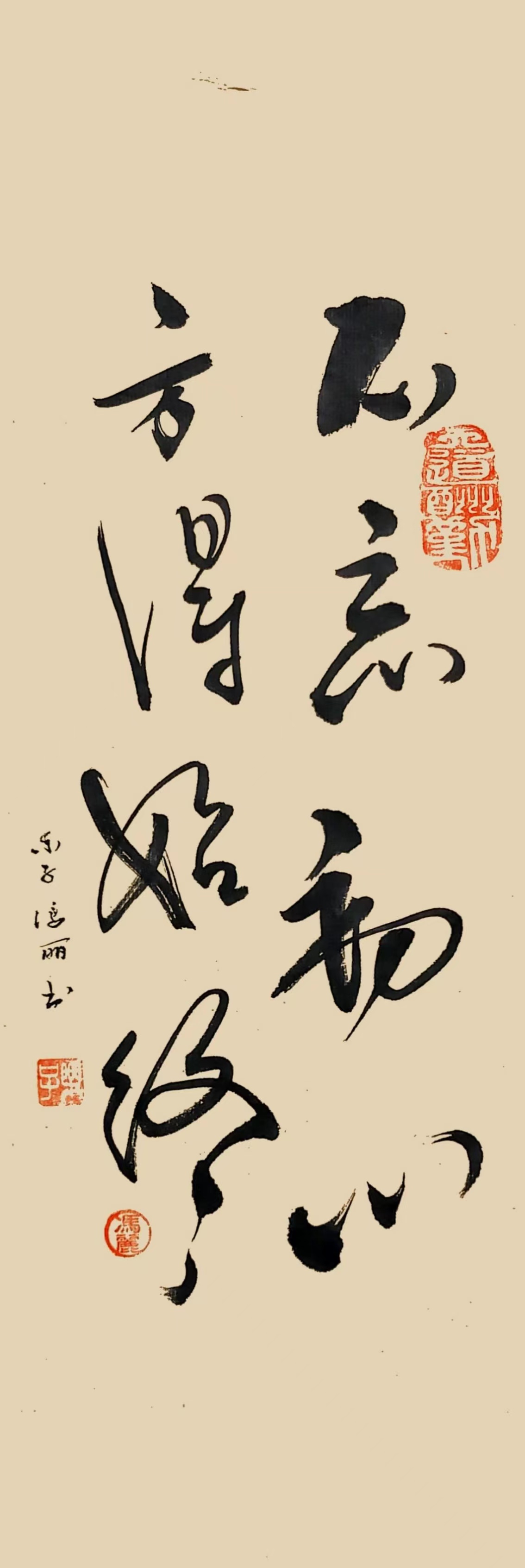 极逸的线条变化,可以说是冯女士今日创作行草书法的一个关键表现点所在,也正因如此,她的行草书风也才会呈现出那纵意而为的心迹格调!当然,无论是笔墨的线条表现,还是书风的纵意气概,其都不可能是凭空而生的,而究其原因,这也都是要归功于冯女士习书几十余年载的反复锤炼!众幅书中用笔线条,是能于一点之内殊衄挫于毫芒,更是能于一画之间变起伏于峰杪,笔墨所到之处,时如龙蛇之竞走,时如壮士之拔剑,上下牵丝映带,左右相顾照映,通幅观之,可谓尽是有将浩然清气贯彻于始终也!外秀性情,内蕴真法,大家气象,此般足矣!