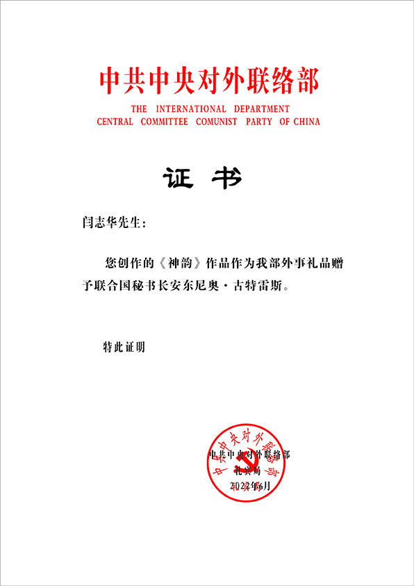 闫志华:字云德,号春雷,1968年11月生,山东临沂人,毕业于西安交大,自幼爱好国学、书画,资治通鉴、儒家思想、周易,对儒释道哲学博大精深的核心思想有着独特的见解和运用,颇有深厚的文化内涵和艺术造诣,创作的《神韵》作品作为国家外事礼品赠予联合国秘书长,安东尼奥,古特雷斯并荣誉证书。