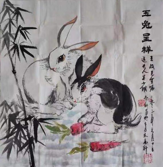 作品2:名称《玉兔呈祥》70cmⅹ70cm生宣纸,创作时间2023年1月13日。