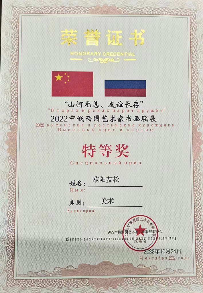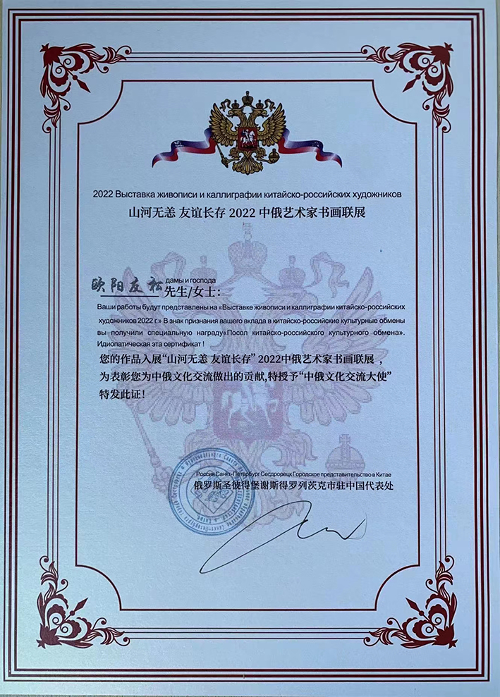 2022年参加中俄"山河无恙,友谊长存,艺术家书画联展,荣获特等奖。授予中俄文化交流大使称号。