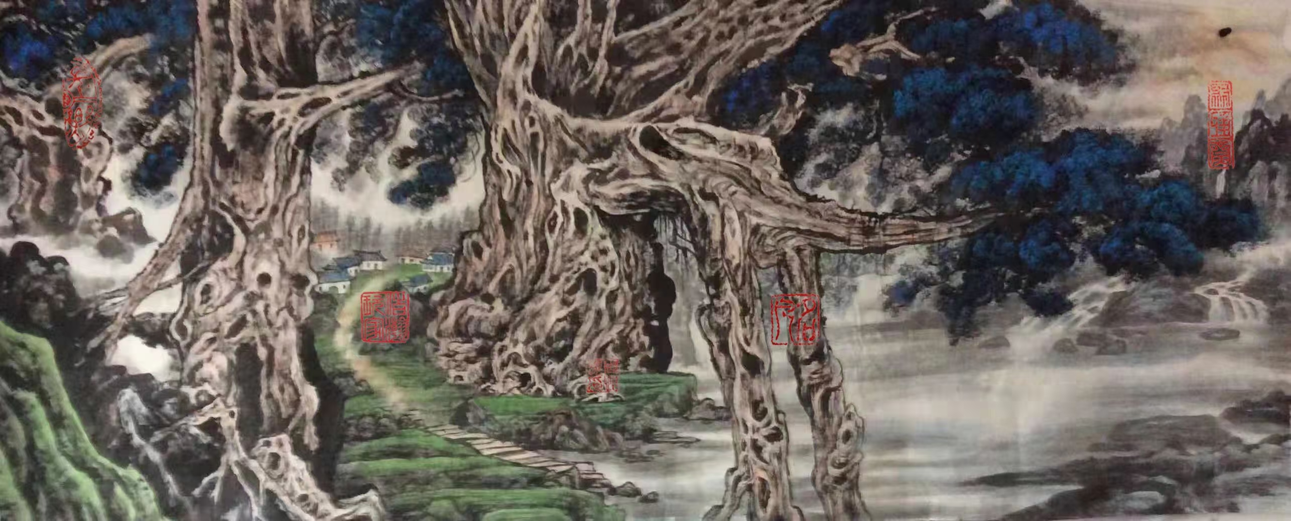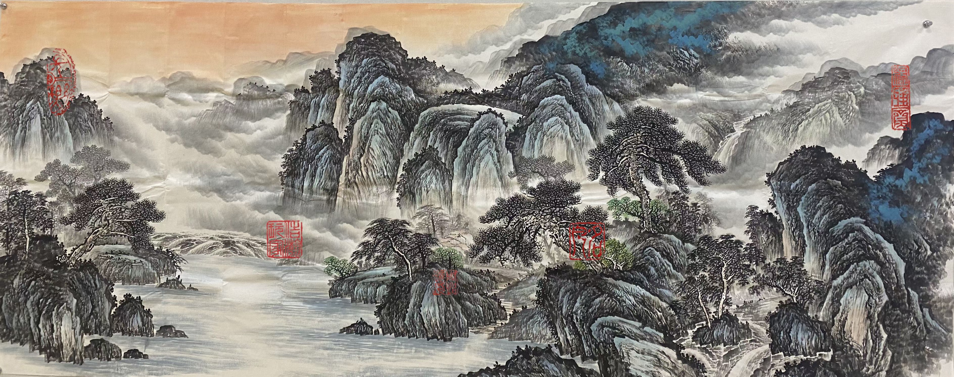 周怡挺先生书法写得功夫绝佳,写意山水就有骨法用笔的精气神,也有随类赋彩的气韵生动。执笔墨作青绿浅绛,写下东崖复沓蔽轻雾,可观西峰峥嵘喷流泉。在他的山水作品里移变换景,可以明心见性,以致澄怀观道。栖丘饮壑,风行雨霁。万里山河笔下渡,云烟供养饰屏障。每一件山水作品都是审美的琼花玉蕊,也是艺术品收藏的和壁隋珠,件件价值连城,收于箱箧,皆是国礼臻品。