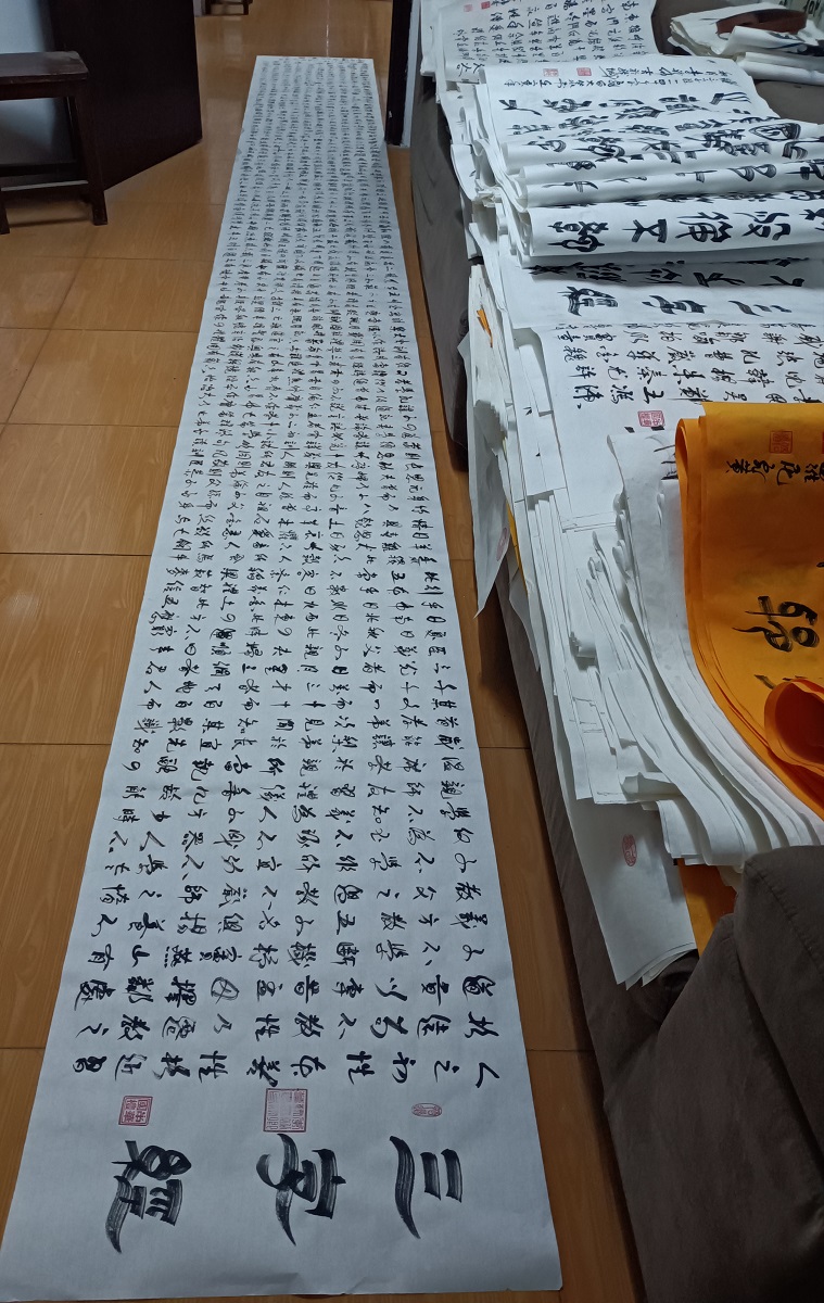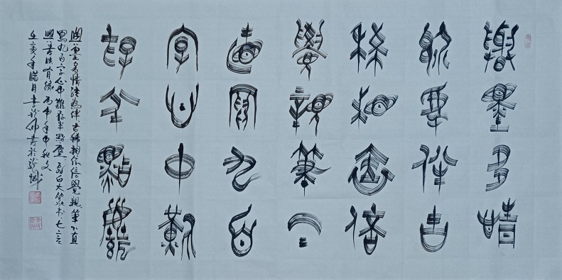 与墨多情结为伴,古稀相依倍觉亲。笔下直写九百字,心中难存半点尘。七言与书法有缘飞白大篆书