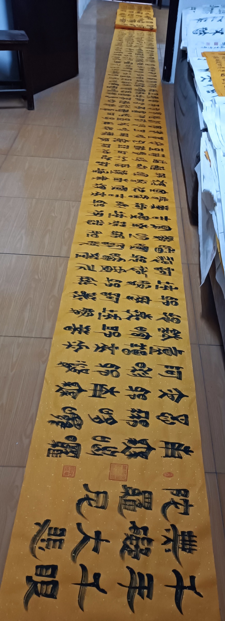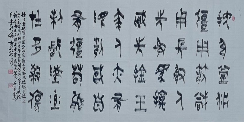 篆法圆润笔力健,章草飘逸潇洒行。隶书撇捺凶险至,飞白立体丝连层。微博名巜墨趣飞白书》可以見到我最新的作品。一直来研练礼器碑.曹全碑.蔡邕大书家的《熹平石经》,李隆基的《石台孝经》,金农横粗竖瘦笔法.刘炳森隶书,李景阳枯笔隶书等名帖名人优秀隶书笔画融入自已的作品中。并研练隶草书。张永明老师的篆书。,今年四月来认真研究学练大篆书。东汉蔡邕大书家先师首创的飞白书(百度里搜飞白书可了解详情)把飞白书笔画融纳到了隶书.篆书,隶草书里。使飞白书这一中华民族优秀文化艺术瑰宝得到了传承发扬。絲絲的飞白墨韵和极强的立体感使李裕卿飞白隶书.飞白篆书,飞白隶草书有了独特的风格韵味。把中华民族优秀文化传统艺术瑰宝传承发展。薪火相传,代代不息!