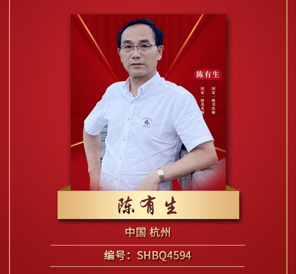 陈有生,号江南,杭州市人,央广国际文化交流艺术委员会副主席,央媒文化组委会艺术会员,中国书法院副院长,中国老年书画研究会研究部副主任,中国大众文化学会书画专业委员会常务委员,中国楹联学会书画艺术院招牌匾创作合作人,中国国宾礼艺术家、人民书画家,非遗传承代表人物,中国书法协会会员,国家一级书法师,国家一级美术师(cys2639)。