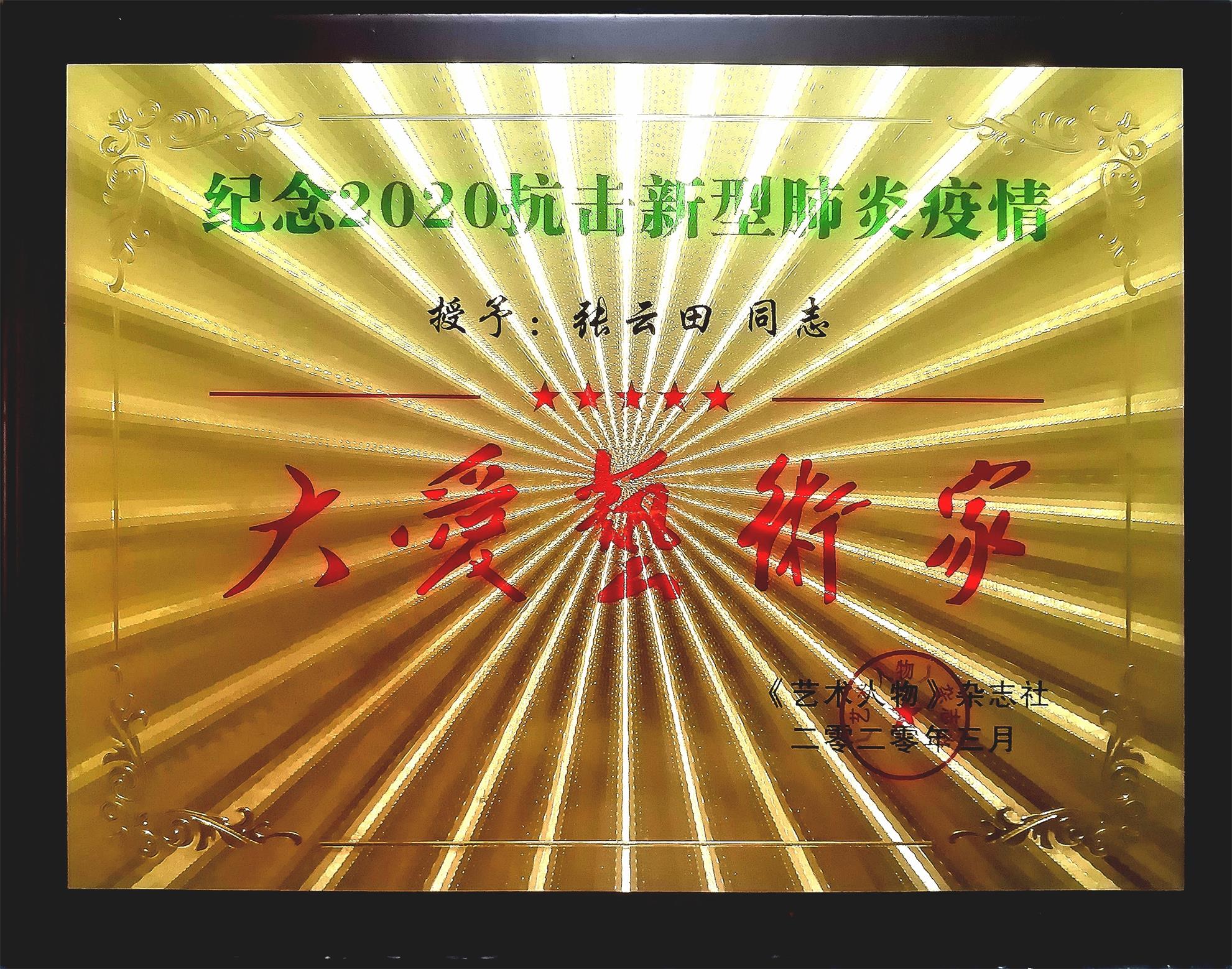二0一0年在北京人民大会堂授予"共和国先进模范年度人物",同年六月被中国时代采风征评组委会评为"中国时代德艺双馨艺术家"其书画作品上海国际品牌节联合国前后两任秘书长,安南、潘基文、法国商学院院长夏代尔及中国政要等众多伟人收藏书画作品遍布国内及世界各国。