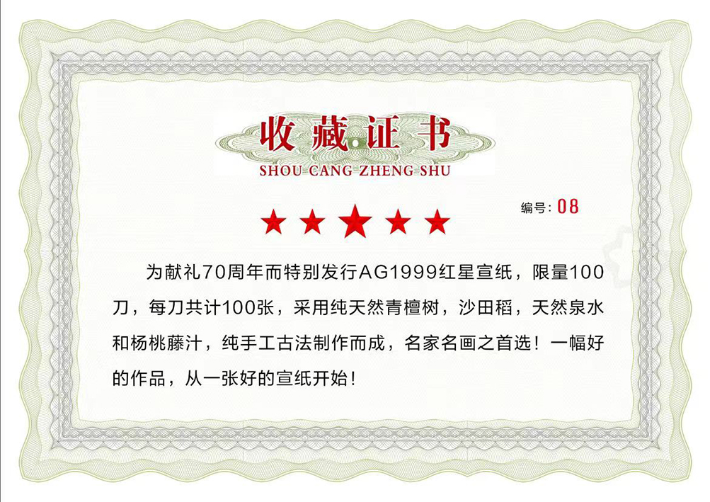 安徽红星AG1999宣纸是安徽红星宣纸进出口有限公司规格最高的宣纸。也是公司为了献礼70周年的时候设立的极品宣纸,规格包括有龙纹宣、生宣、熟宣、半熟宣。