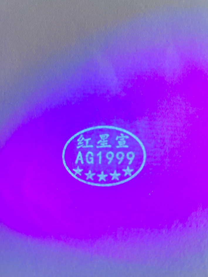 由于市面上冒充安徽红星AG1999宣纸的商家层出不穷,所以安徽红星宣纸进出口有限公司在每一张宣纸内加入了特殊防伪标记,在防伪紫光灯下安徽红星宣AG1999清晰可见,并且防伪标记内有5颗红星,用于分辨真假安徽红星宣。