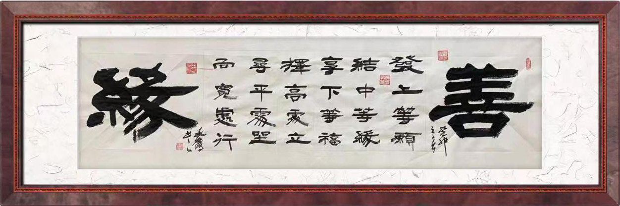 《善缘》2015年受邀入选两岸文化书画大展;2017年参加兰亭书法国展;荣获2018年在第四屆全国名人书画大赛中获一等奖。2019年在央视元宵晚会现场创作此幅作品。2020年在中国美术馆入展全国书法名家展参展作品,此墨宝被国家博物馆永久收藏。