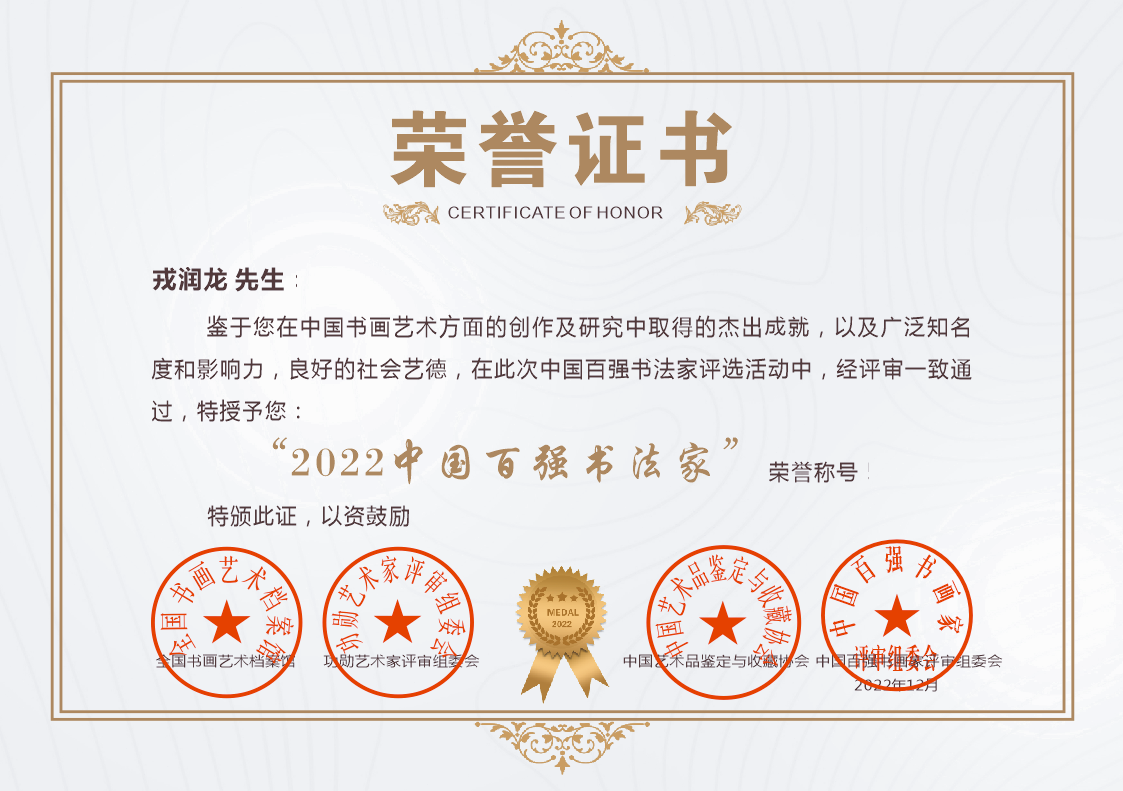 这么看来,戎润龙先生确实是一个書法奇才,称他为中華書坛栋梁之材也是当之無愧的。在数十载研習書法之路上,他谦虚好学,从几岁就沉醉于颜、柳、苏等体,后又苦临"二王"及欧阳询等古代大家,受益匪浅,成就非凡,他先后出版了《中國書画艺术精品集锦》,第一届、第二届、第三届、第四届、第五届、第六届、第七届、第八届、第九届《中華颂》全國文学艺术大赛颁奖大会典藏书画刊。多次参加全国書画大赛,获奖無数。曾有评论认为,戎润龙先生用笔若定,中锋扎实,起收沉着,结字凝练,点画温润厚重,造型工整,布排合理,重心稳定而简洁淡遠的筆墨线条之下是骨力的练达和意象的宽博秀美。所以他的書风端正儒雅,隽秀飘逸,有一种正大之象和雍容之气,中和之美,艺术价值不菲。筆者觉得,这样的评语用在戎润龙先生的書法作品上是贴切的。功夫不负有心人,多年笔耕下来,戎润龙先生的書法创作得到了广泛认可,名气也越来越大。譬如《伟人颂》全国書画大赛获得金奖,《东方美》全国诗联书画大赛获一等奖,《奥运有我》全国書画作品巡回展荣获金奖,纪念辛亥革命100周年全国书画大赛荣获金奖,第三届《祖国好华语文学艺术大赛荣获一等奖,巍巍中华*纪念书圣王羲之 画圣吴道子 诗圣杜甫 词圣苏东坡全国书画大赛荣获金奖等等。我们相信在今后的岁月里,戎润龙先生还会取得更多的佳绩!