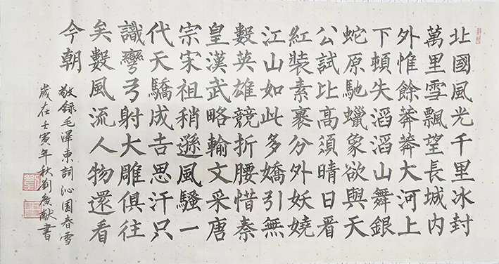 刘广献,男,笔名:刘真功,1968年7月出生,籍贯河南省新郑市,自幼与书法结下不解之缘,酷爱双勾书法艺术,苦临名帖30余载,尤爱唐楷之柳风,王羲之赵孟頫之行书更使我为之倾心,终日临池不辍,曾得益于马成功老师和书法大家们的指导。经常参加各类社会活动,参赛并获奖,现为河南省书法协会会员,河南长生书画院理事,中华柳体研究会会员,郑州市书法协会会员,郑州市双勾书法协会理事,新郑市书法协会会员,郑州文博书画院院士。书学有派,根植传统,立志为弘扬中华书法文化而奋斗终生!