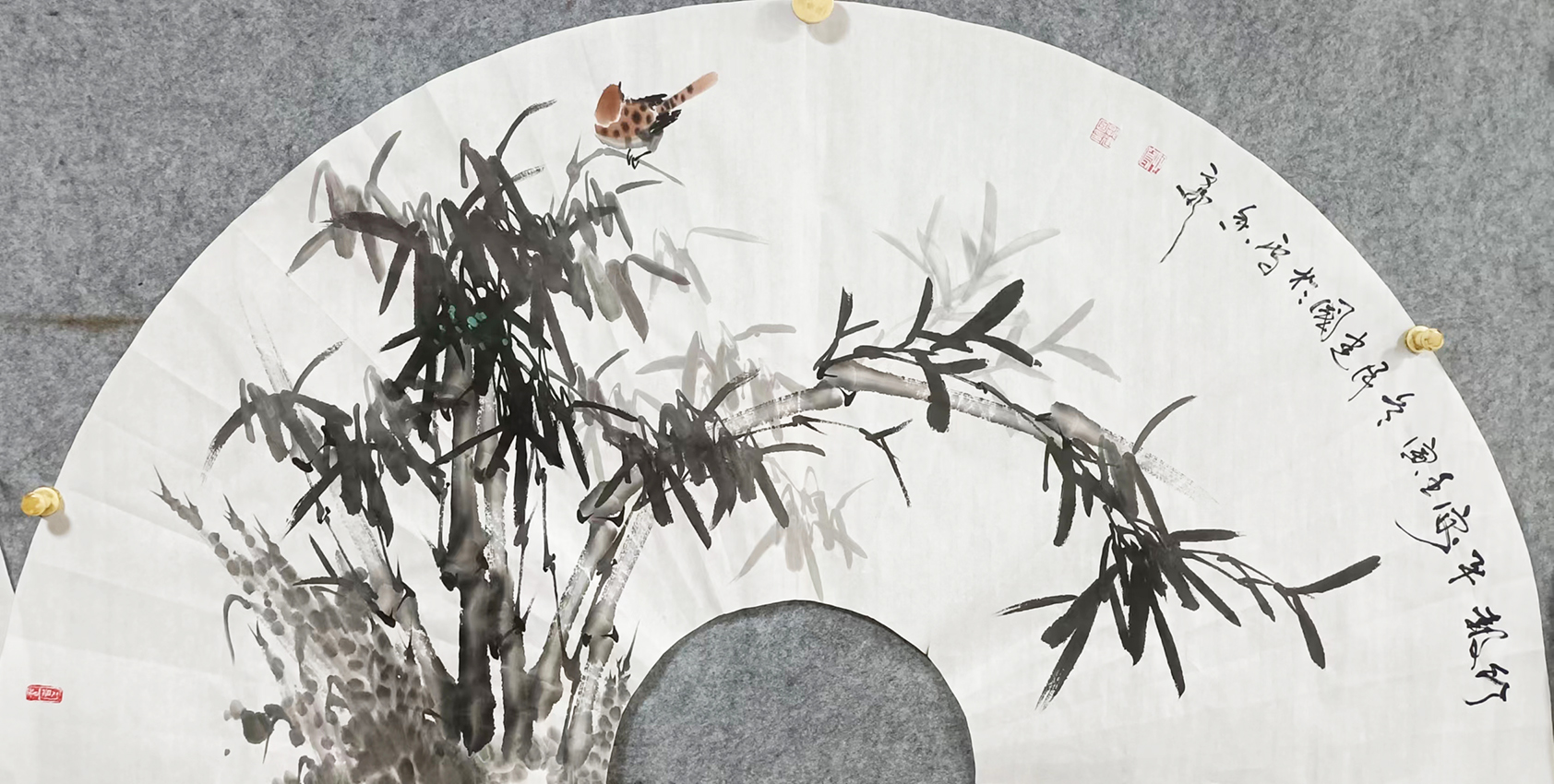 相对于牡丹画作的雍容华贵之意,郭建国先生的梅花墨竹等题材则就是更加倾向于一种风骨独树的表现语境!首以梅花作品来看,画中梅花傲立而生,墨写枝杆,粗枝遒健有力,小枝弥漫丰富,梅花花卉更是尤以亮红之色彰显气概,花瓣红渲,花蕊点染,如此再搭配雪中之境,整体画面风骨更是极其不凡!铮铮气象,一览无遗!继观其墨竹作品,画中墨竹以扇面为布局,用笔流畅而不失浑厚,用墨凝练而不失洞达,行笔所止以成节,落墨妙变以成叶,而如此线面之间的意象表现,观之也真可谓雅俗共赏也!君子气概,尽赋其中!