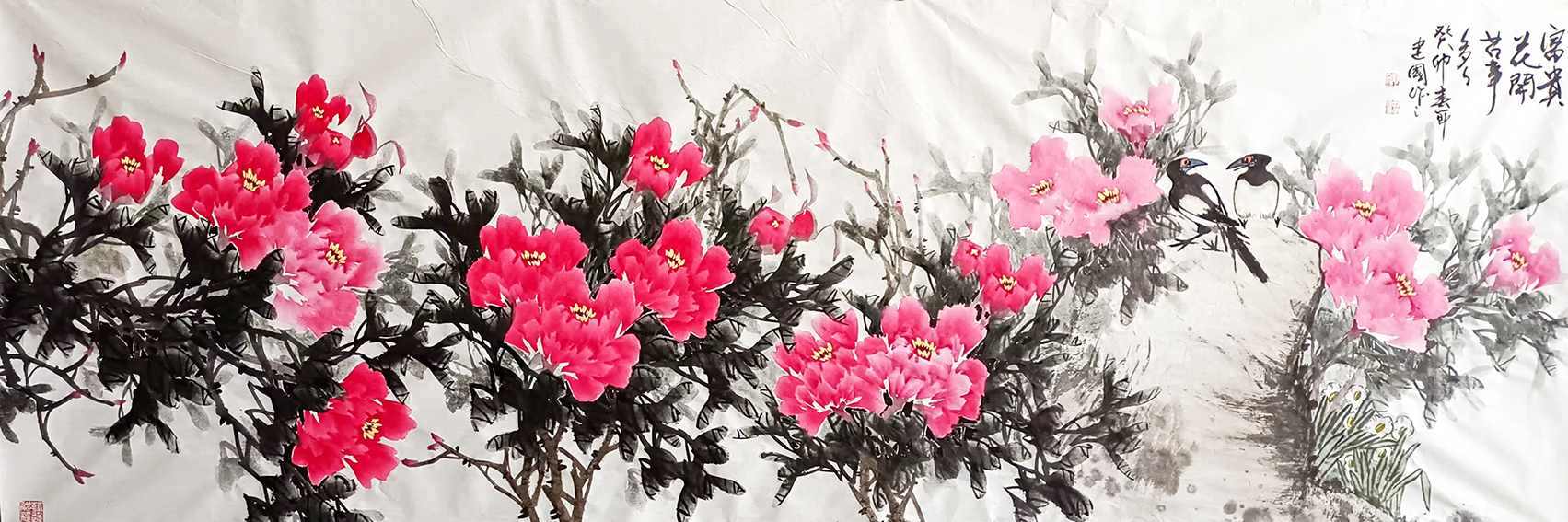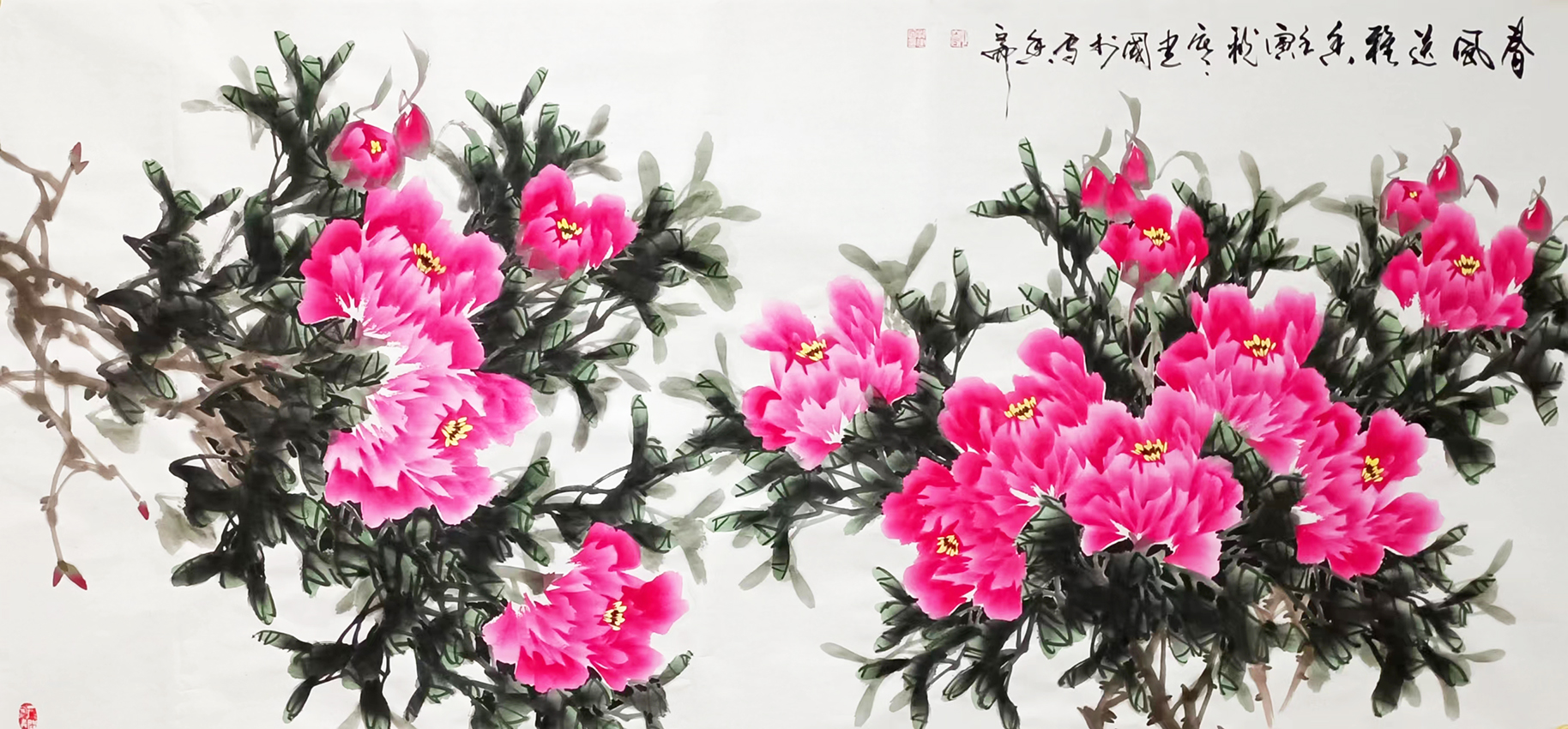 欣赏郭建国先生的牡丹画作,就如同是进入了一个世外隐秘的牡丹花境,让人不由得为之倾心且沉湎。牡丹笔墨,构意雍容且高雅,色彩更是艳丽却不俗媚,水墨色三者交融之际,可谓尽是有致雅性于盎然也!而郭建国先生之所以能在牡丹画作中达到如此妙境,其很大原因就是来自于他那深厚的文人情怀和寄情感受,懂得牡丹外在的自然形神,更懂得心迹流露的花韵交融,因此与其说郭建国先生是在绘作牡丹,倒不如说他是在用牡丹为载体,并以此来彰显其内在的性情与精神!诗情画意,引人入胜,国色天香,佳作共赏!