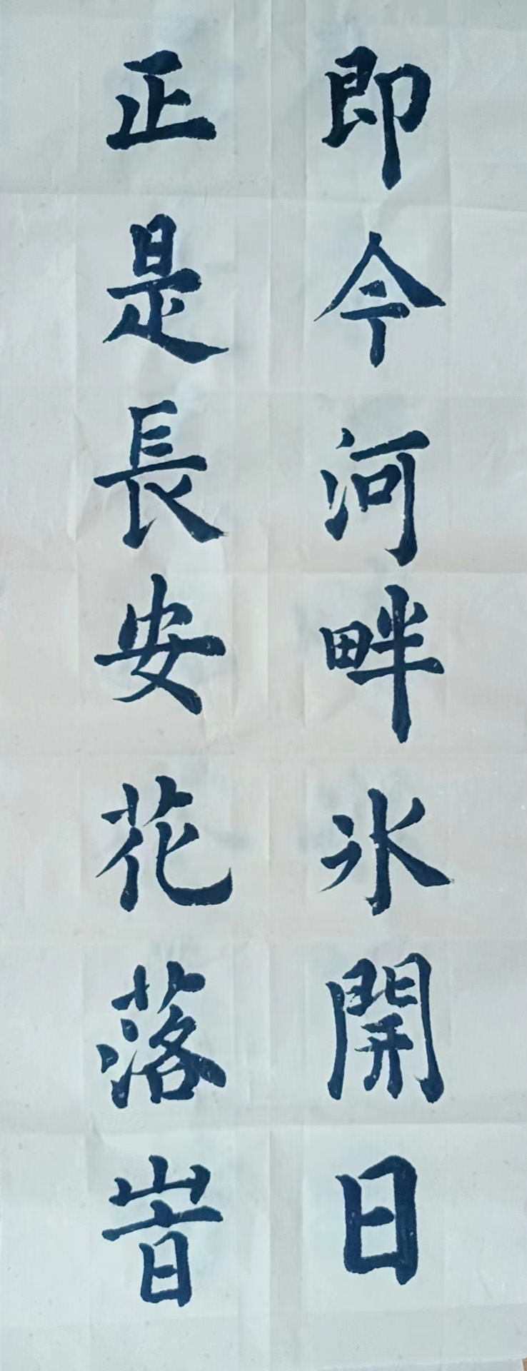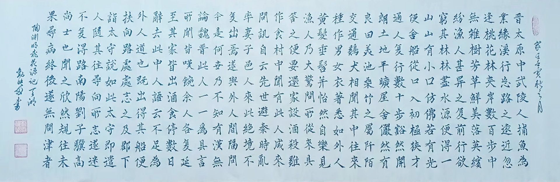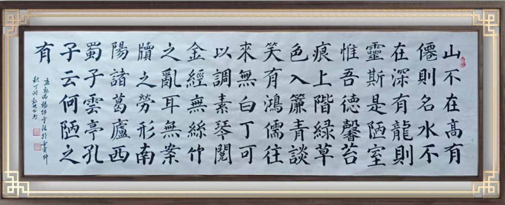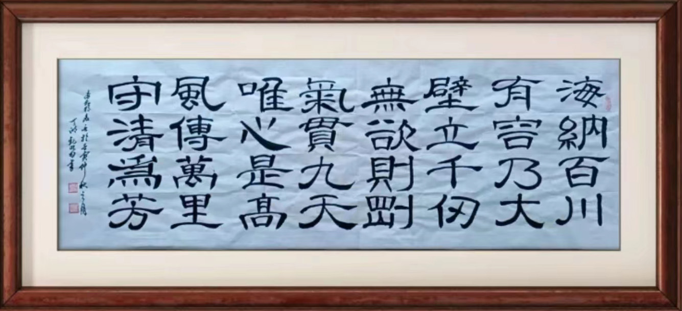 楷法无欺,乃为共识,而今刘映田先生执笔作楷,其翰墨功底亦是可见深厚无疑!其楷书是有取颜真卿之骨肉,但却又丝毫不失于赵孟頫之妙韵,作中笔力的沉着稳健,更是有为其楷书体势造就了一种清劲且遒健的洞达质感!一幅横幅之作,排列稳重整齐,字势之内刚健与险绝并存,端庄与典雅并济,是谓既有平稳旷达的视觉美感,也有骨中藏肉的饱满之格!干净利落,可谓超群!
