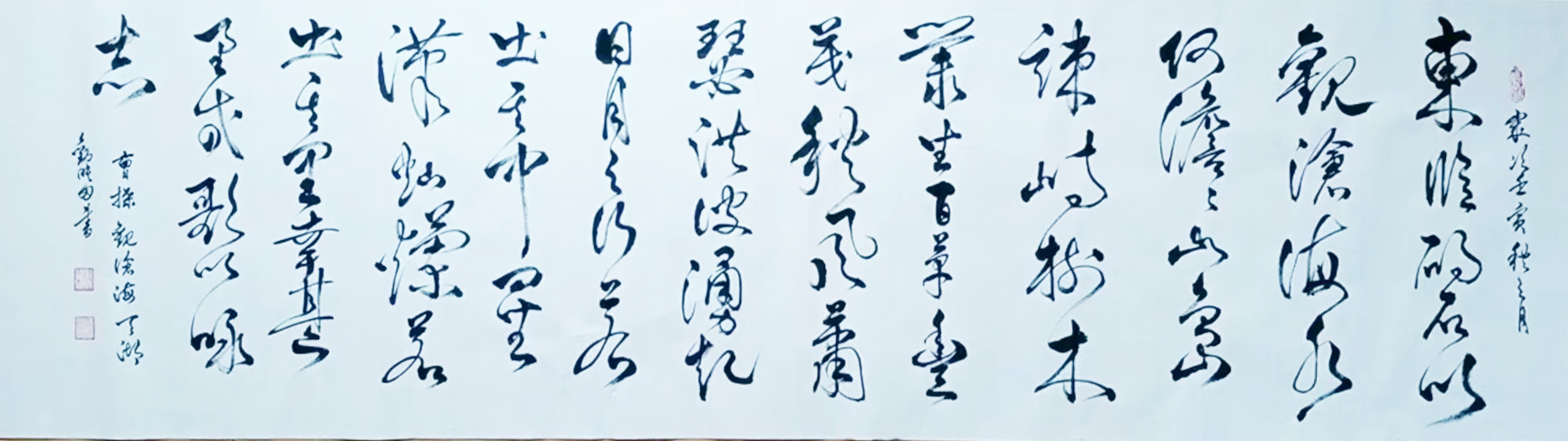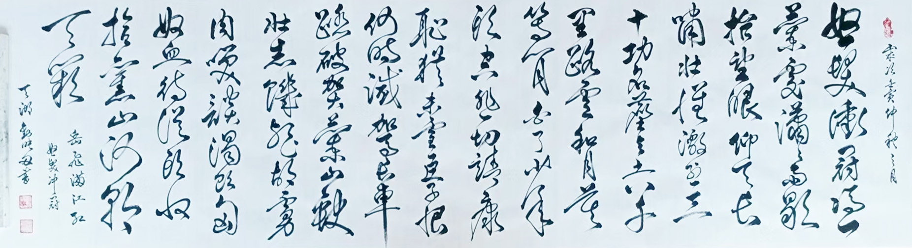 首从刘映田先生的众幅行草书法作品来看,其作中笔法可见来去之自如,落笔慷锵有力,行笔奔放洒脱,而经此所呈现出的笔墨线条,自然也就是能在轻重急缓中妙造华章!线条时而凝练于浑厚,时而又能纵意于潇洒,浓墨处犹如龙蛇之竞走,可在一点之内殊衄挫于豪芒,枯笔处又如苍木之遒健,可在一画之内变起伏于锋梢!书势飞动,造意奇绝,于此纵览,撼人心神!