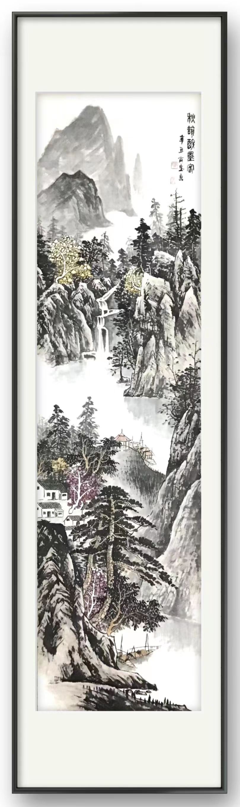 以郭岗生先生的一幅《山韵》作品来看,画中山水无论是绘作山石之峰峦,还是绘作流水之人家,郭岗生先生都是能赋予其丰富的笔墨构意,画中一些地方甚至还会穿插多方景色,并以此来为整幅画面提供不同的层次质感和视觉延伸!山势造极而见其险绝,林木丰茂而见其生动,村居坐落其中,溪水绵延而出,而如此画面中的一动一静,也全然都是有得益于郭岗生先生那精妙无比的审美布局!逸气流露,简而意足,清闲避世,可赏可居!