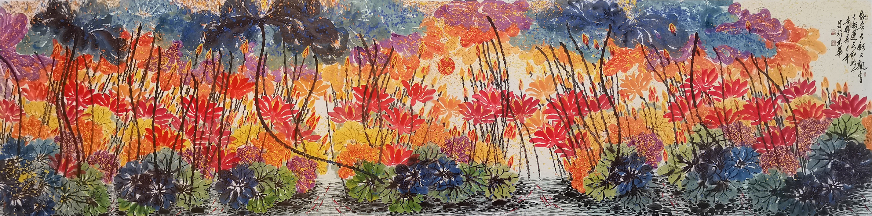 2019年创作完成《七彩莲花长卷》是经过写生创作出荷塘四季变化的不同意境。