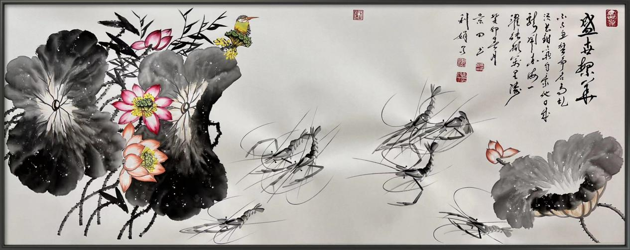 《盛世繁华》花团锦簇布满整个画面,河虾姿态各异,水墨蟹的加入,更是做到了画龙点睛之笔,使整幅画面更加灵动。水墨虾 水墨蟹均以齐白石大师的笔法技巧创作,同时也融入到了个人风格特点,“学我者生似我者死”,在传承齐派水墨技法上有了新的突破。