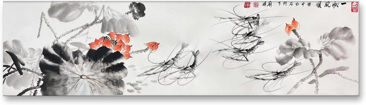 《一帆风顺》花团锦簇布满整个画面,河虾姿态各异,水墨蟹的加入,更是做到了画龙点睛之笔,使整幅画面更加灵动。水墨虾 水墨蟹均以齐白石大师的笔法技巧创作,同时也融入到了个人风格特点,“学我者生似我者死”,在传承齐派水墨技法上有了新的突破。