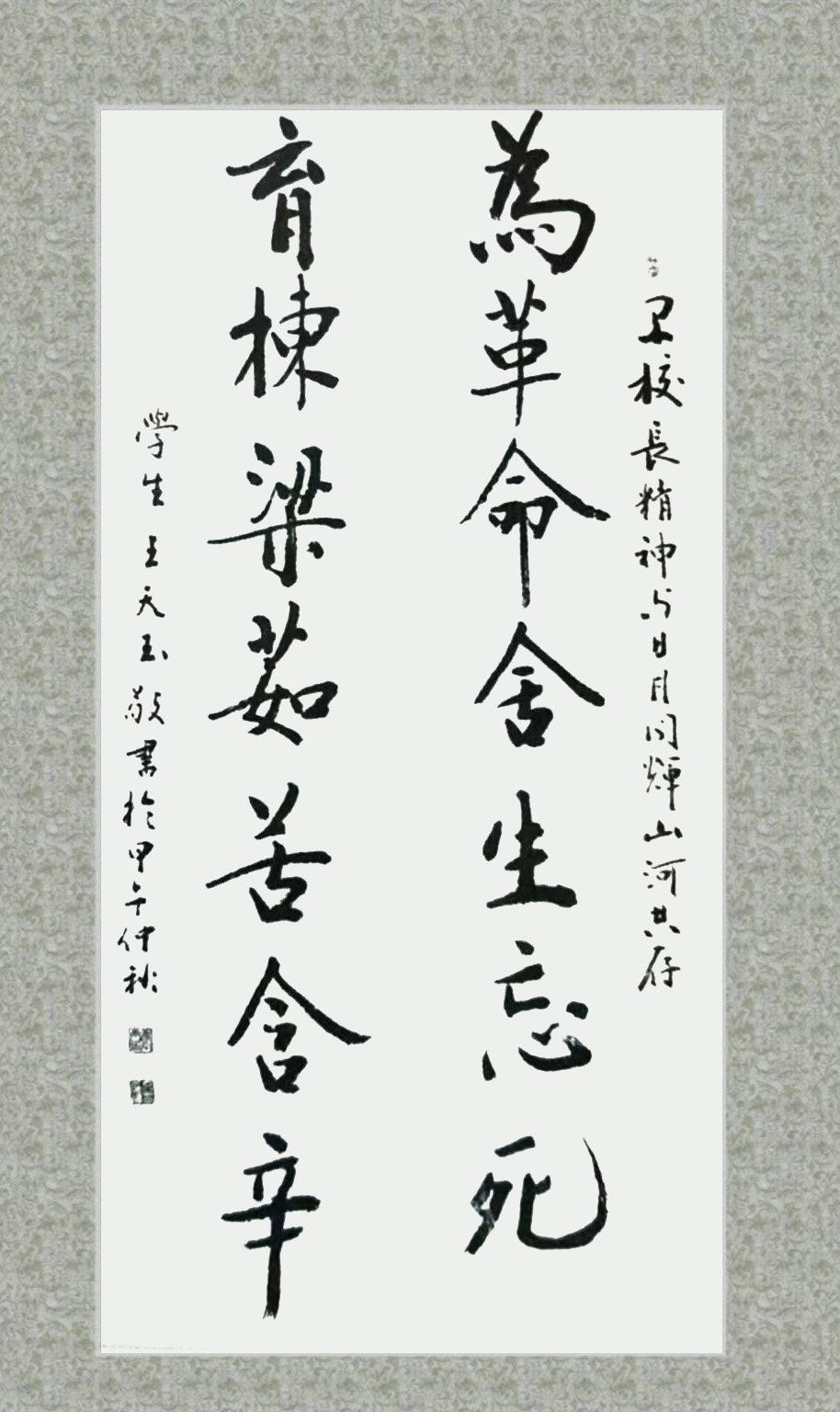 自小喜爱书法,曾静心临摩王義之《兰亭序》、《圣教序》以及近代启功等字帖,楷书临摩欧阳询《醴泉铭》等数载。大、中行书、行草书皆优,门牌、匾书皆可,横、竖、扇书写流畅,小楷作品多有亮点。作品曾在中央书画频道播展,全国《诗联》、《书法》及省税务《金秋》等杂志数次刊登。所写《金刚经》被上海华珍阁艺术馆永久收藏,所写“忠义"二字被关公故里一一解州关帝庙永久悬挂,所抄写习近平总书记"十九大报告"(32000余字),十九大"修改后的党章"(20000余字)共九长卷,平铺八十八米被闻喜税务局收藏,省、市、县三级报刊及电台都作了典型报道。书法作品参加省、市、县三级展出,获奖五十余次。尤其是启功体作品,清秀洒脱,深受各级评委和大众好评。