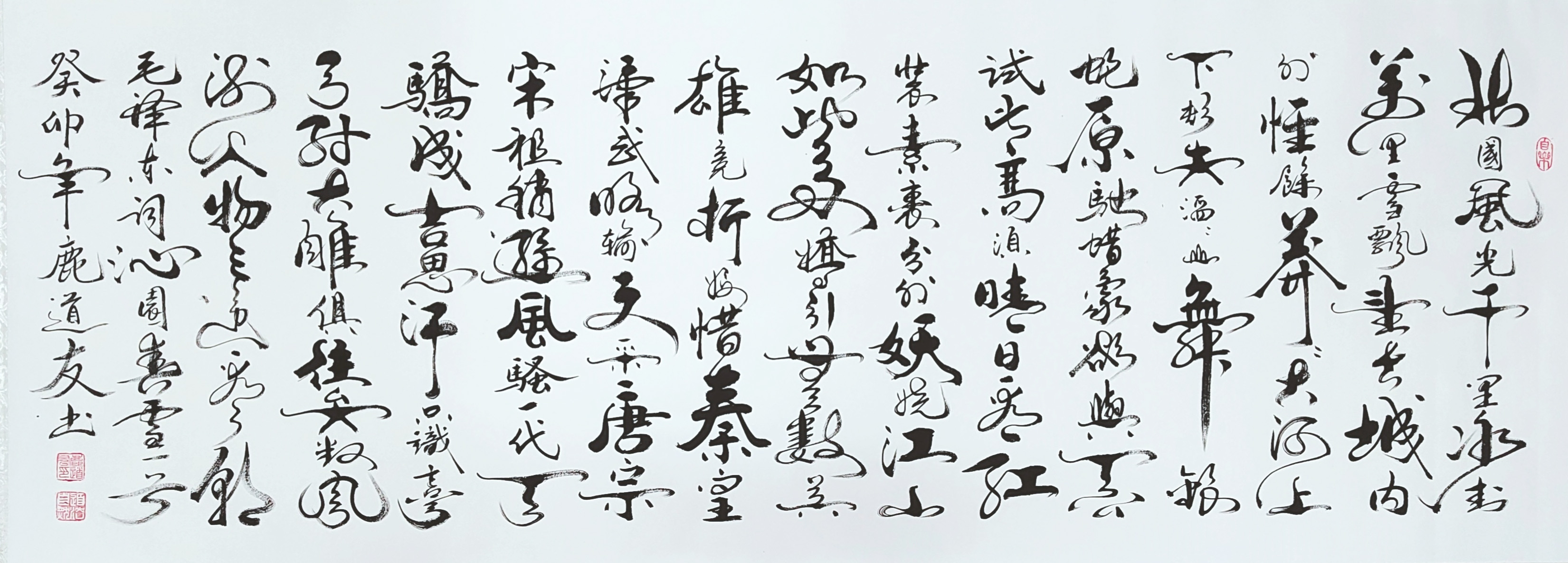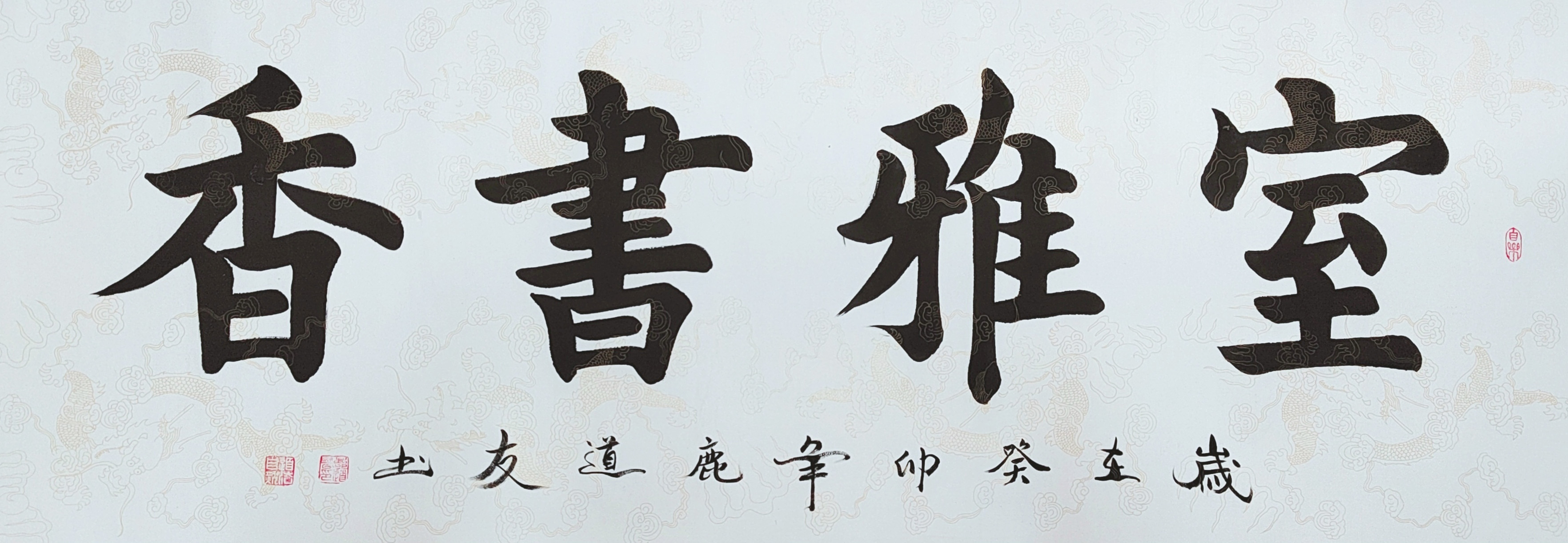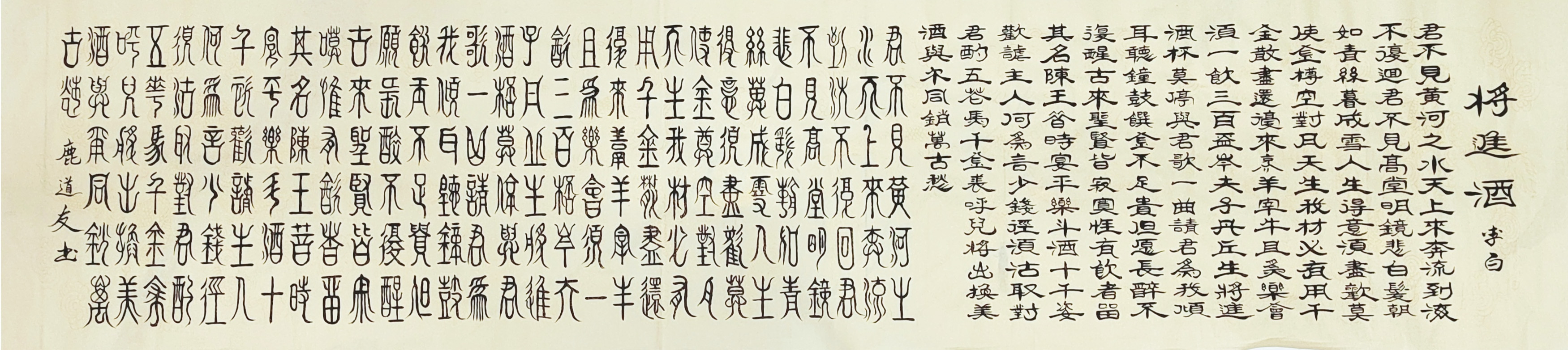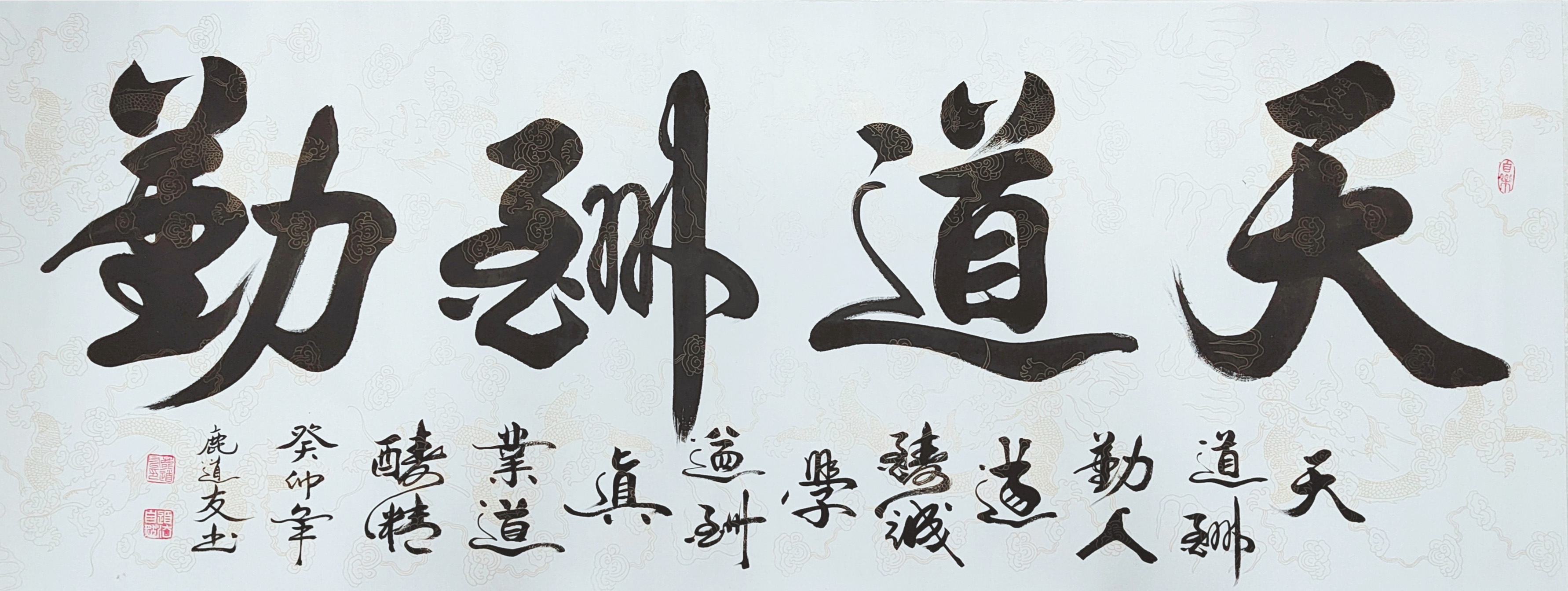更为可贵的是,鹿道友先生的篆书作品有很强的文化弘扬实际效应。篆书一体在当代书坛,有被忽视甚至被边缘化的流弊,这是因为篆书创作缺少笔墨当随时代的创新风范。鹿道友先生借古开今,以书法形态切题当代审美主流,把篆书写出了可以装饰万家屏障的文化效果,大制作,长篇幅,又能一气呵成,令笔里有墨,墨里有笔,把篆书一体的“小众属性”给替换成大众审美的赏心悦目。