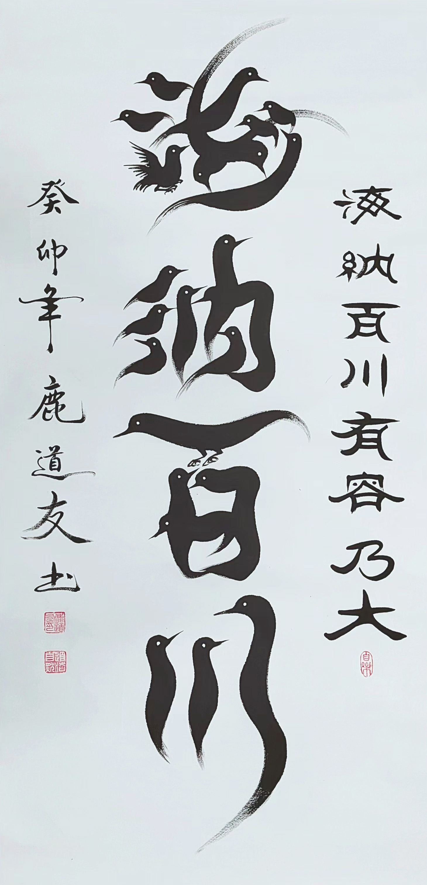 在家居厅堂挂起他的篆书作品,可以看到虬龙蜿蜒、鸾凤徘徊的美学魅力,成为人们非常喜欢的篆书塑造形态。所以他的篆书作品不但有着相当精深的学术价值,还有相当宽厚的审美力量,这就是鹿道友的篆书作品赢得文化影响力,拥有收藏价值力的重要原因。作为中国鸟体字的创始人,他把书法“拟形显神”的核心本质用精彩的点划形态表达出来,让人一看如遇书法创新的琼花玉蕊,独树一帜,与众不同,这正是书法创新一代宗师的卓越功勋!