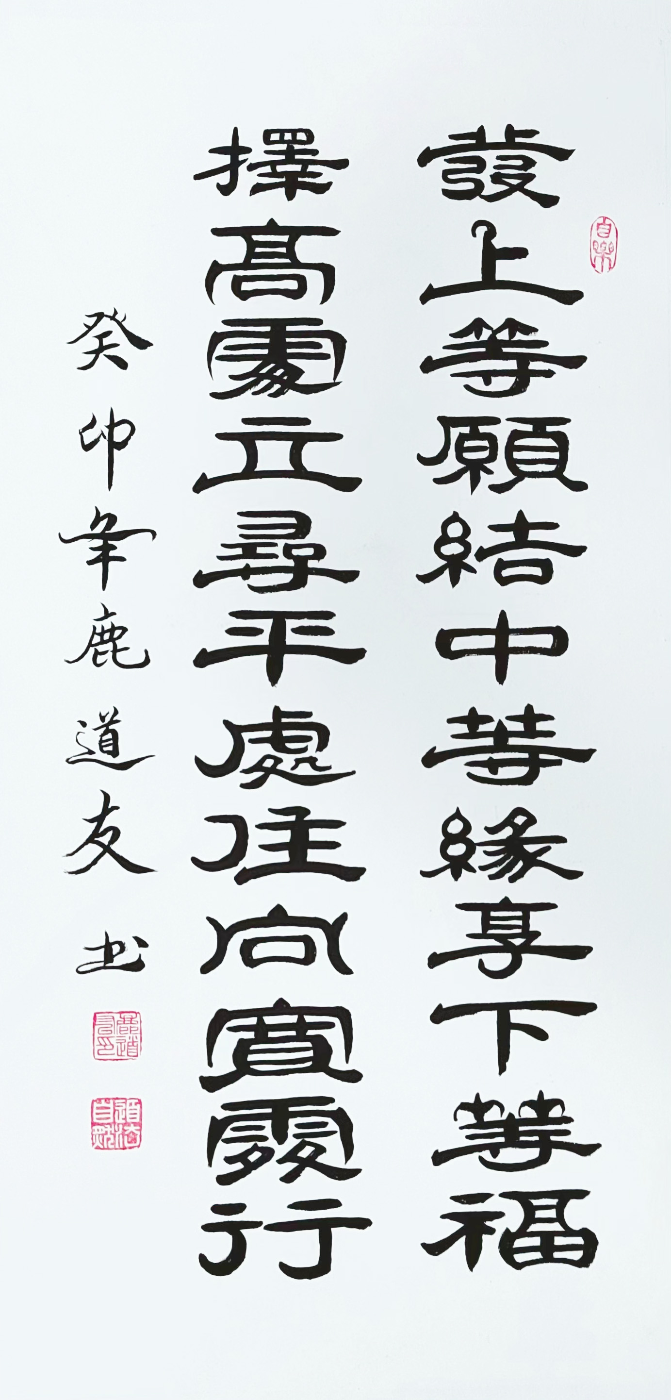 从书法修养的宽度来看,鹿道友先生诸书皆成,博涉多优,写得一手金书锦字。其籀篆琢磨,取法甲骨金文,参意泰碑峄山碑,把篆书一体写得刚柔相济,极有古文字书法的正大气象。王羲之作书论有言曰,穷研篆籀,功省易成,攥集精专,形彰势显。如今看鹿道友先生的篆书作品,果然深谙书论,可以在起笔落笔之际,把古文字书法写得令人万分折服。字字有讲究,笔笔可透纸。中锋行笔,写出篆书满满的金石气象,极有叩击山河的精气神!