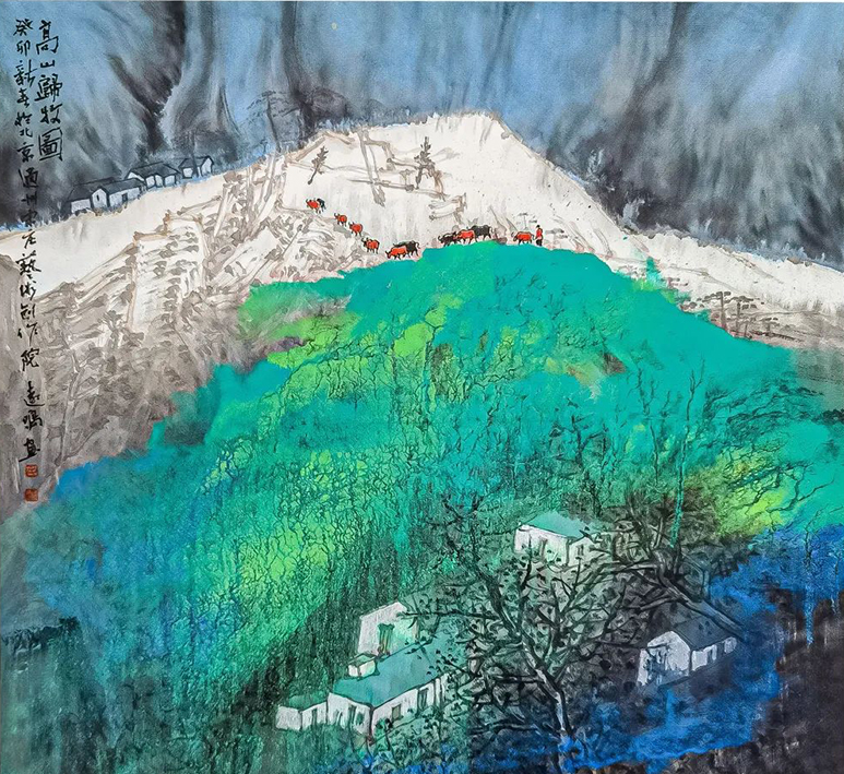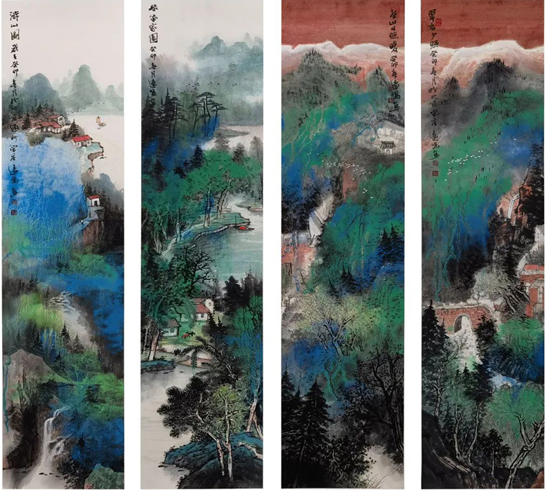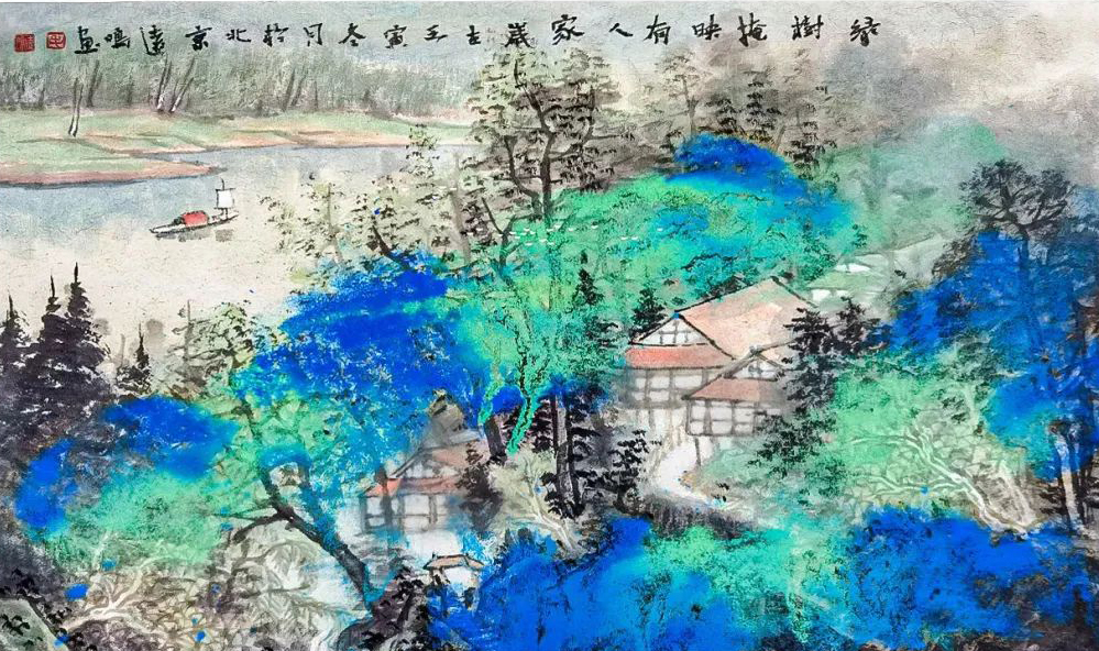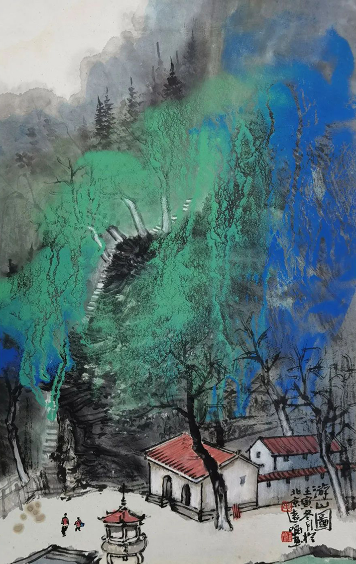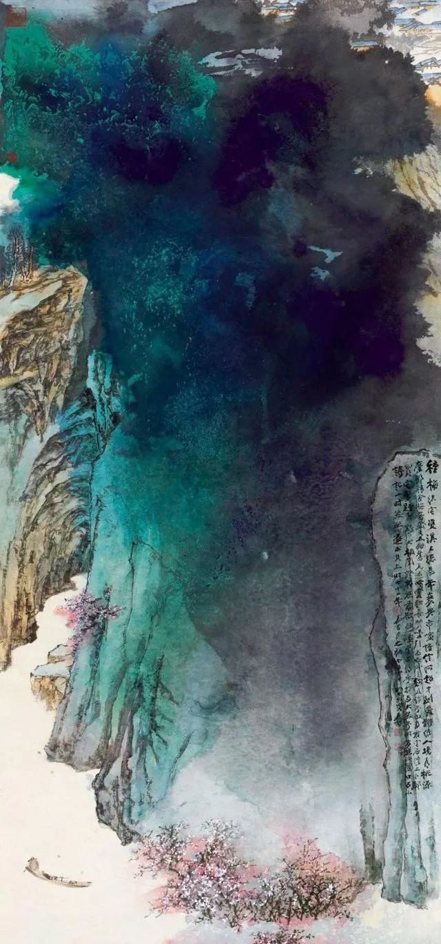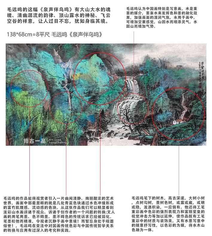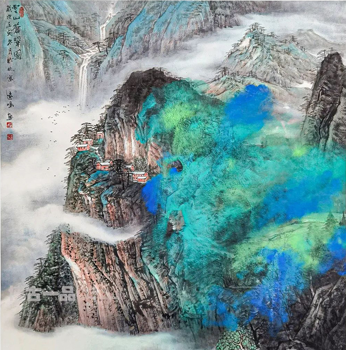 毛远鸣的作品,初看清新瑰丽,再看有“苍深渊穆”之境.近期创烟雨皴的泼墨山水,奇伟瑰丽,与天地融合。增强了意境的感染力和画幅的整体效果。
