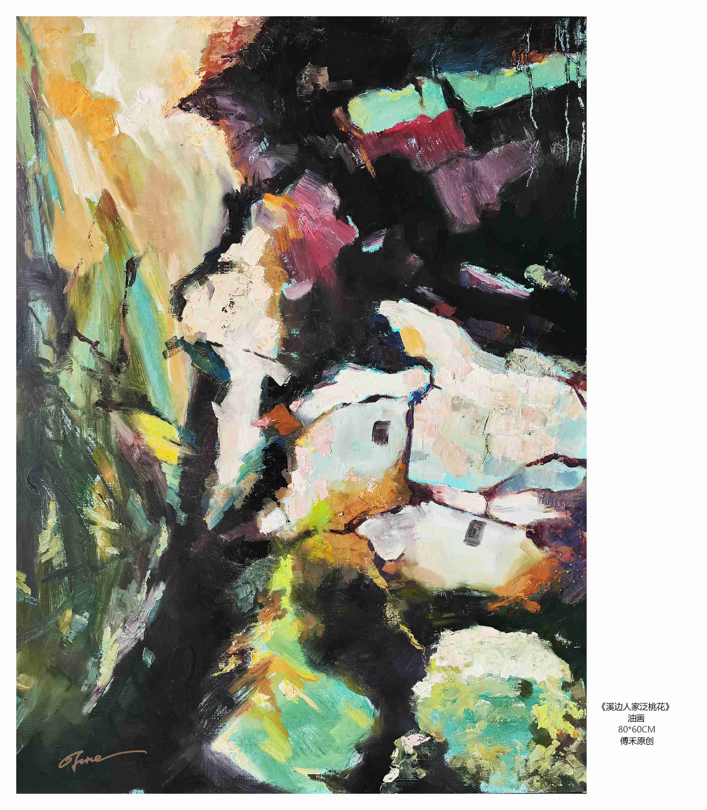 譬如在傅禾先生的一幅《溪边人家泛桃花》作品中,他就是有通过极强的笔触肌理来展现自然风景和桃花风情,而画中的那些色块状结构,也更是能从另一角度上展现出他本人对于抽象意味的心迹体验,当然,并非是所有油画艺术家都能在抽象油画上一蹴而就,相比于写实油画,这种作品则是更加需要画家拥有丰富的审美视野和生活阅历,因为只有这样,作品才能在心境和写生的转换上完成视觉蜕变,而今日的傅禾先生则无疑就是这样一位成功的实践者!