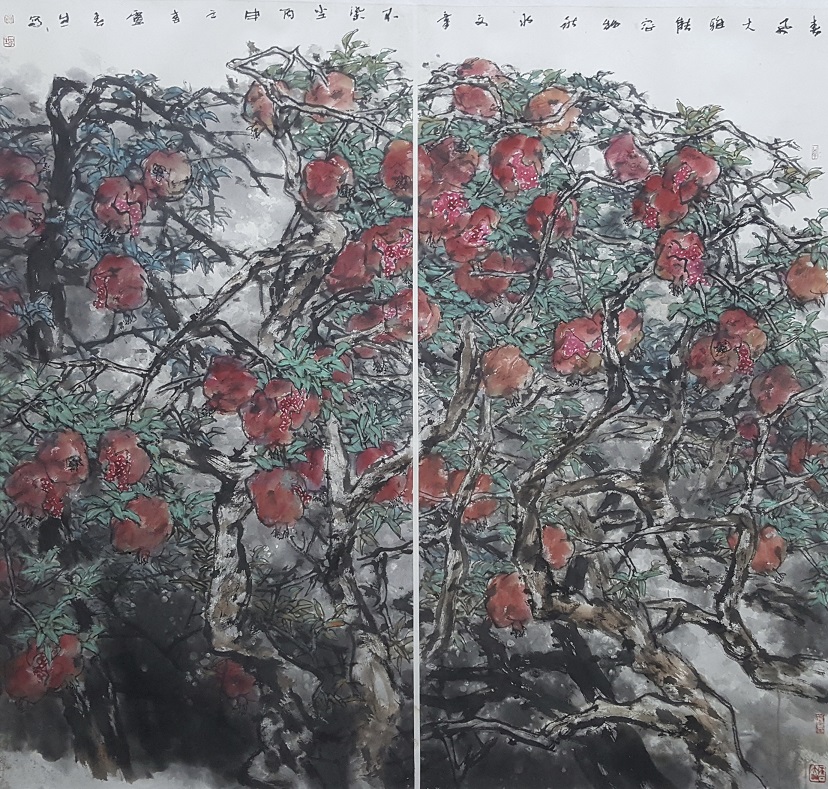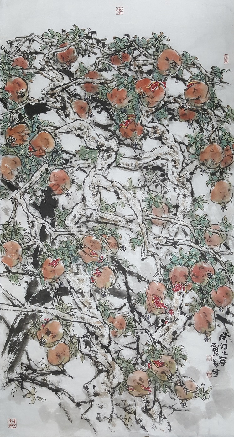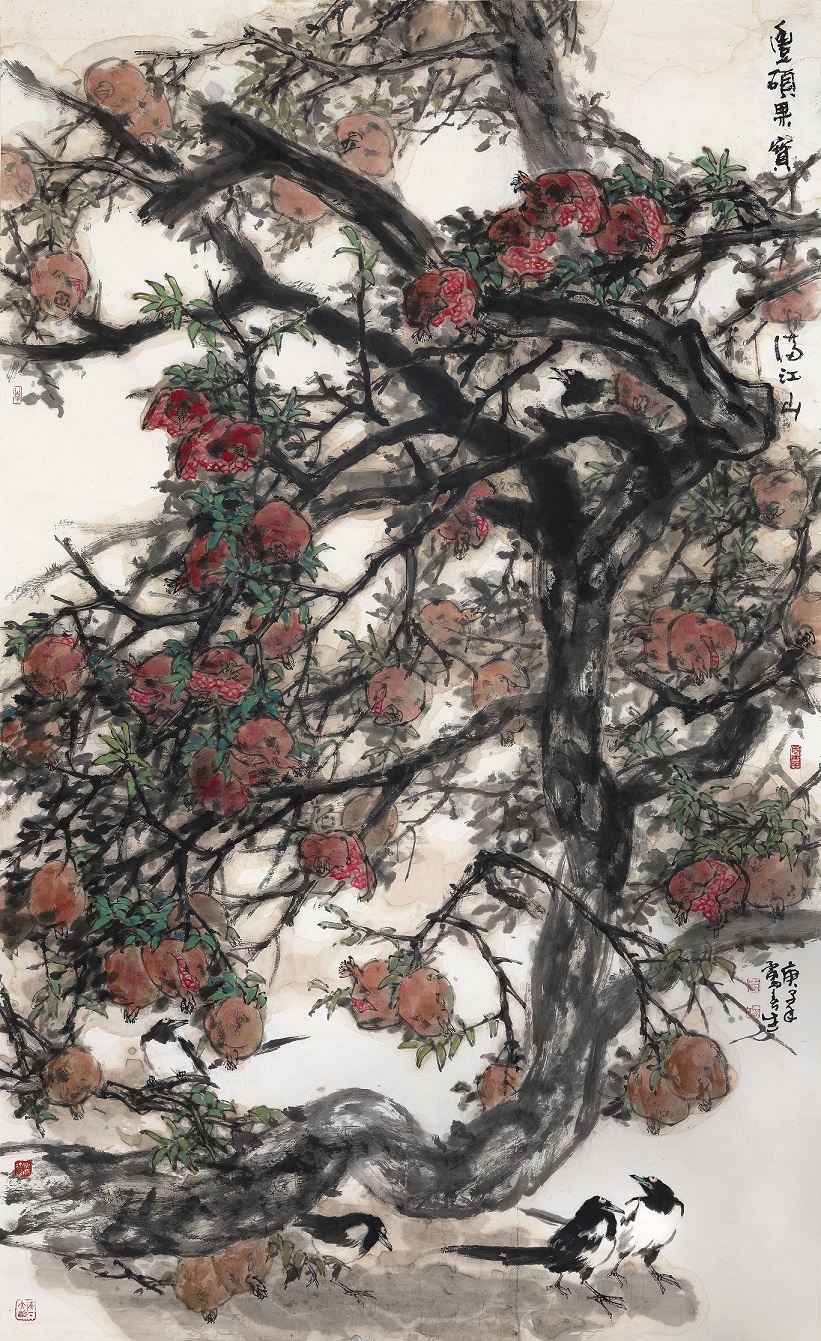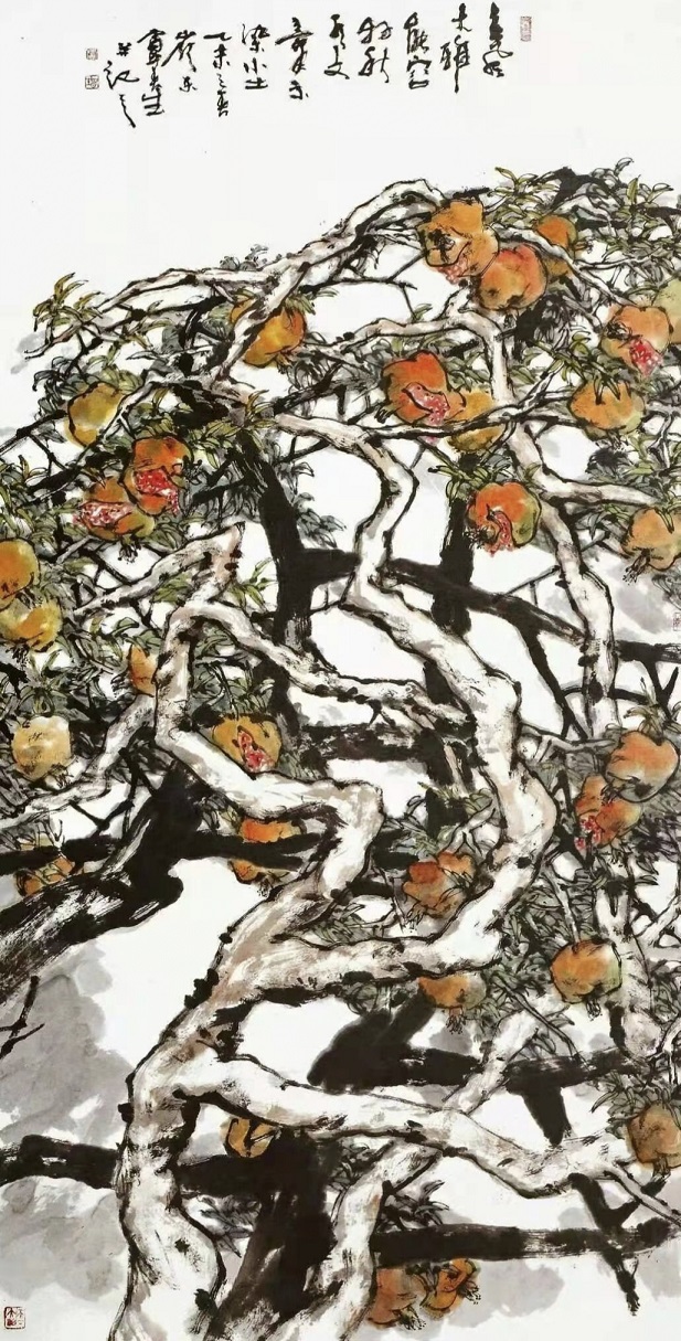 清代名家蒋和曾于〈学画杂论立意〉一书中有言,是曰未落笔时先须立意,一幅之中有气有笔有景,种种具于胸中,到笔着纸时,直追出心中之画,理法相生,气机流畅,自不与凡俗等。今卢春生先生作为一名实力派画家,其自然也是有深谙于此妙理法门,故而作品皆能以览物之情为本源,首重心迹直抒,更觉逸气使然!从写意作品来看,画中题材尤以石榴最为众多,用笔更是极其强调一种意在笔先的挥毫感受,古拙而不失其真,苍润而不失其韵,墨色的交融,更是能达到一种浓而不媚,艳而不俗的视觉表现力,颗颗石榴,时而独自垂头于枝干,时而三两聚拢于叶下,是谓繁密之处不繁乱,简疏之处不简单,布局丰富,可品可察!而那寄情自然的写意气象,由是也尽是可以一目了然!