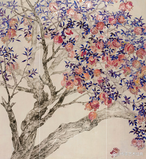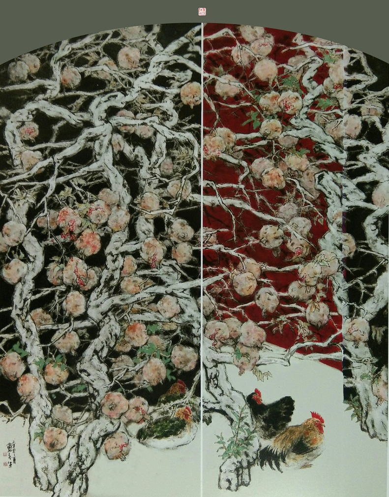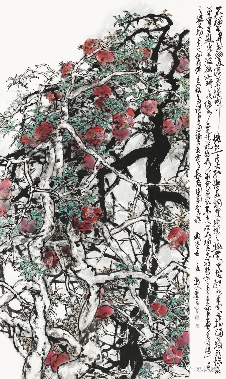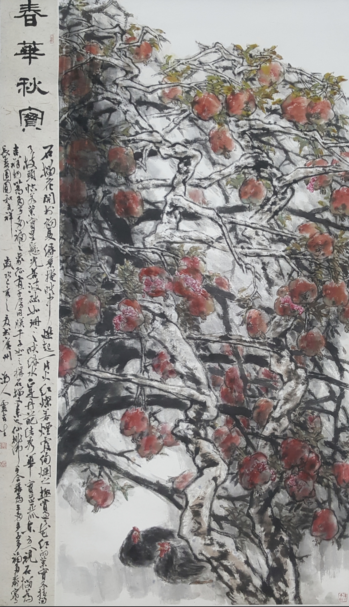 清代名家蒋和曾于〈学画杂论立意〉一书中有言,是曰未落笔时先须立意,一幅之中有气有笔有景,种种具于胸中,到笔着纸时,直追出心中之画,理法相生,气机流畅,自不与凡俗等。今卢春生先生作为一名实力派画家,其自然也是有深谙于此妙理法门,故而作品皆能以览物之情为本源,首重心迹直抒,更觉逸气使然!从写意作品来看,画中题材尤以石榴最为众多,用笔更是极其强调一种意在笔先的挥毫感受,古拙而不失其真,苍润而不失其韵,墨色的交融,更是能达到一种浓而不媚,艳而不俗的视觉表现力,颗颗石榴,时而独自垂头于枝干,时而三两聚拢于叶下,是谓繁密之处不繁乱,简疏之处不简单,布局丰富,可品可察!而那寄情自然的写意气象,由是也尽是可以一目了然!