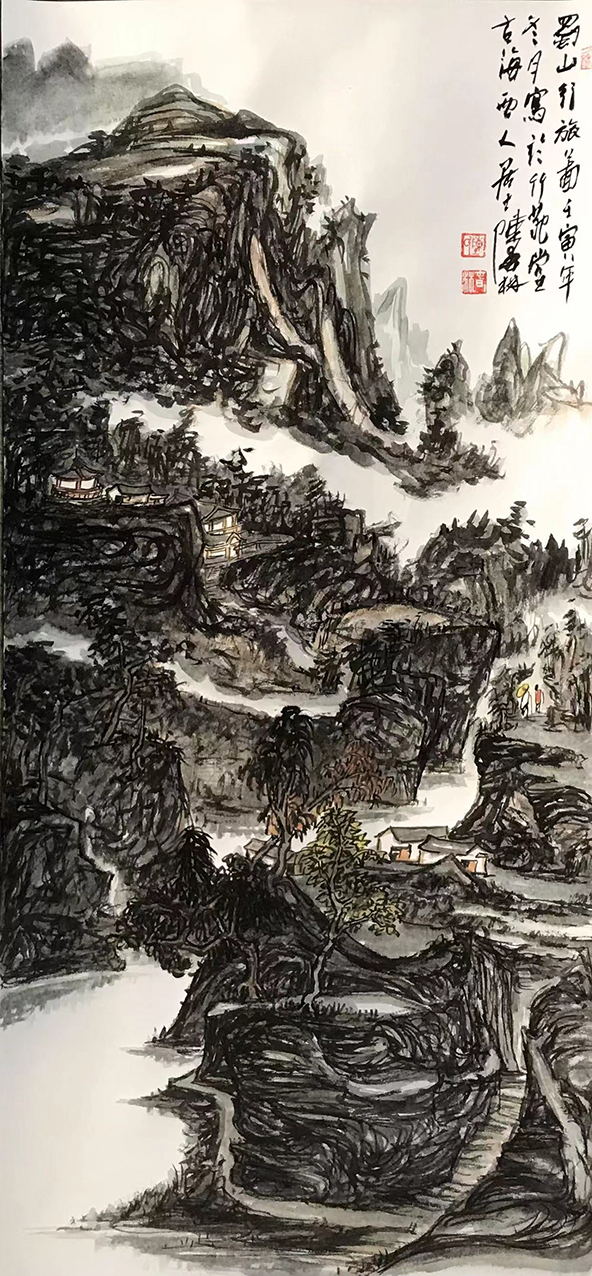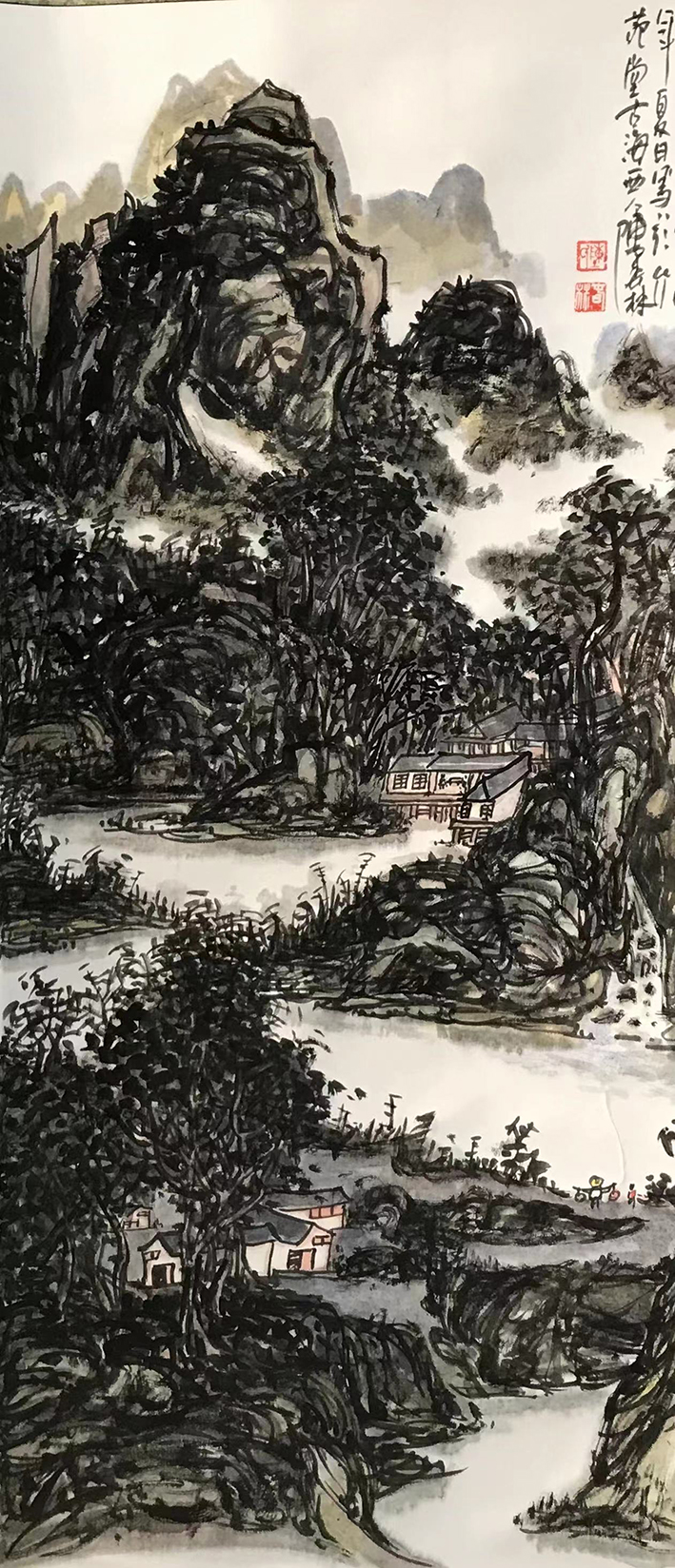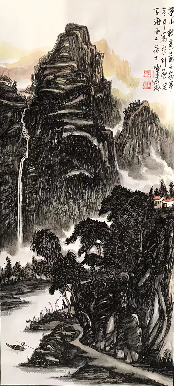 相比于西方的油画艺术,传统的山水国画创作则是更加倾向于对画家心绪的呈现,正如清代蒋和曾于〈学画杂论立意〉一书中所言,是曰:“未落笔时先须立意,一幅之中有气有笔有景,种种具于胸中,到笔着纸时,直追出心中之画,理法相生,气机流畅,自不与凡俗等。”而在今日陈春林先生的众幅山水丹青画作中,我们也是能很清楚地看到其胸臆之抒发!对他而言,只有通过览物之情的写生升华,作品才能在笔墨中付诸于性情,继而构其意,蕴其境!因此单从这一方面上来看,陈春林先生的山水造境就绝非是属于单一的笔墨技法呈现,而应当是一种自我情怀的精神映射和情感载体!