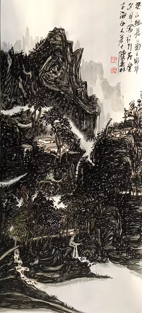 写生脉络,是能够充分依据于搜尽奇峰打草稿的传统本质,笔墨技法,亦是能深切根植于意在笔先的挥毫境地,故而其画中无论是山水气象的层峦叠嶂,还是松泉林木的繁密逸景,观之都是可以令人为之倾心共情!高山流水绘山川,是可以品其清雅妙然,险峰松间造绝势,更是可以感其风骨畅神,而如此古韵淋漓的山水画面造境,也无疑就是有得益于陈春林先生的心志寄托!凝神著思,豫在目前,消隐俗气,可谓正大!