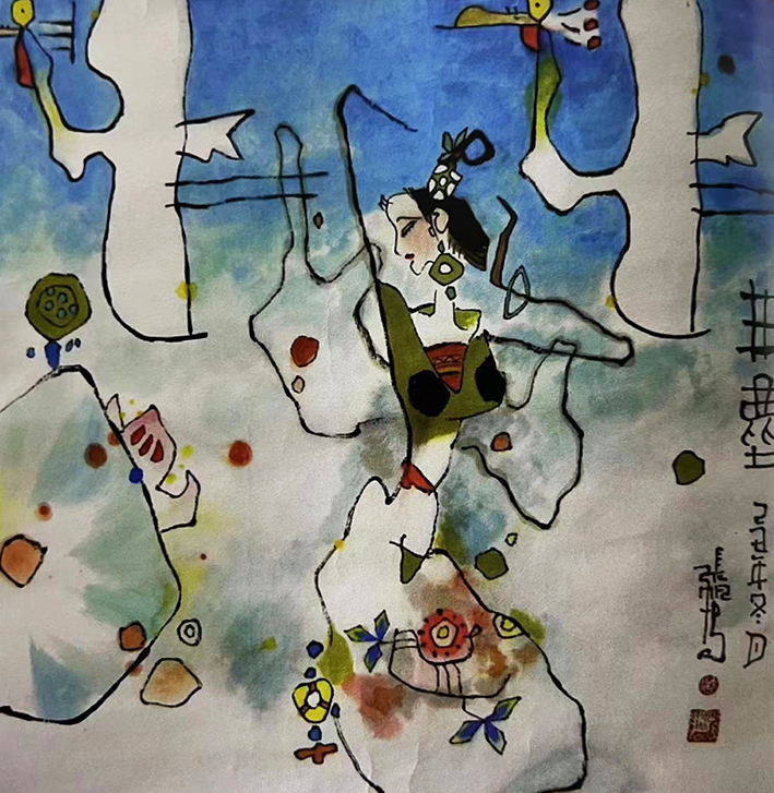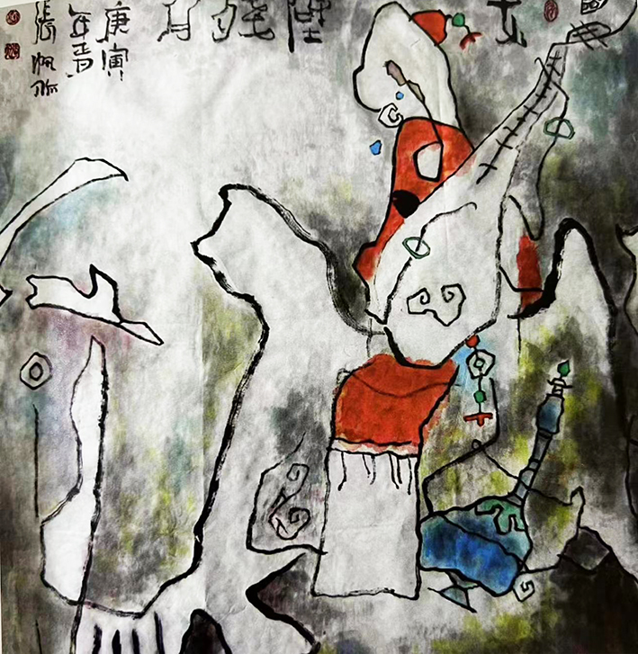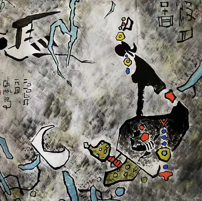 她创作作品依据古人遗留在贺兰山阴山山脉和内蒙古大草原的岩画以及汉化石像上的原始艺术而创作的符号化、图腾化的返朴归真的原生态艺术,填补了东方艺术的一个空白,被东西方艺术评论家们一致喻为人类艺术的新品种。她是当代这个门派的开山鼻祖。她热爱中国传统古今文化,诗词歌赋和经典的民间典故和优美的历史传说,致力于创新的重彩画人物和山水作品已成为中外著名艺术拍卖行的重头拍品。