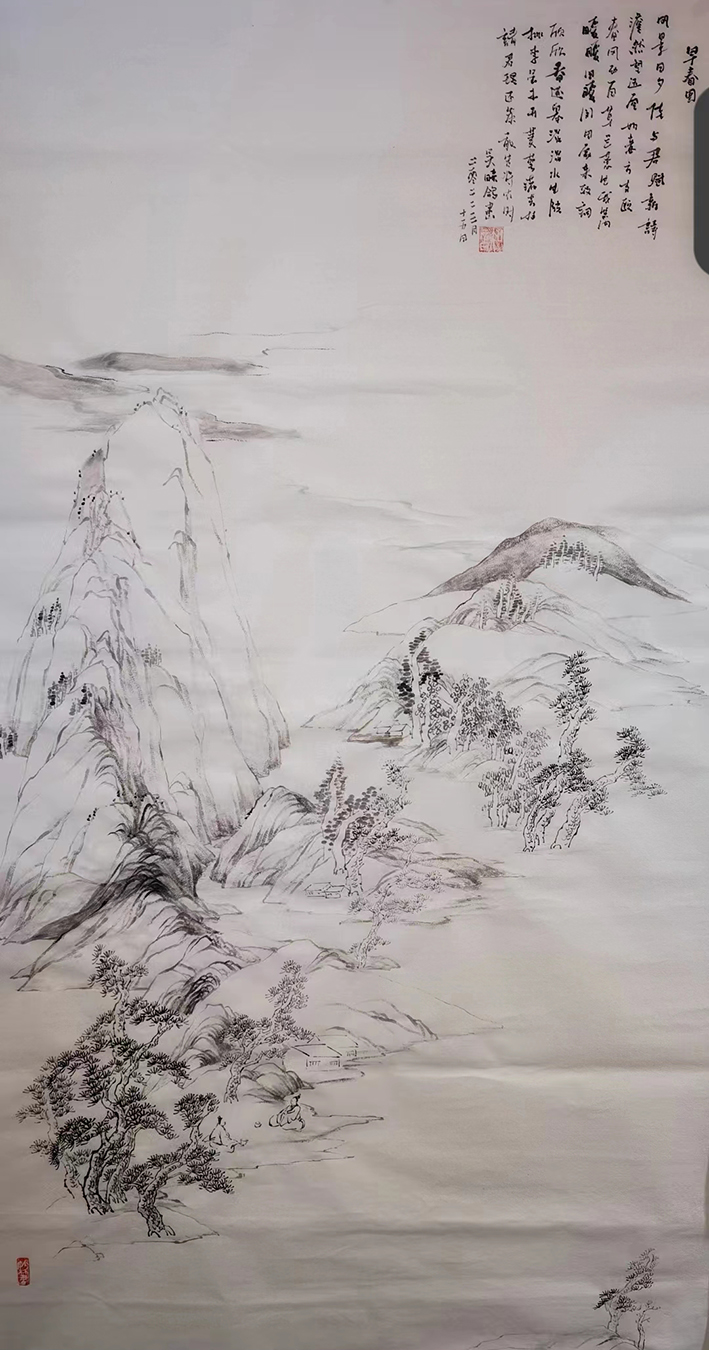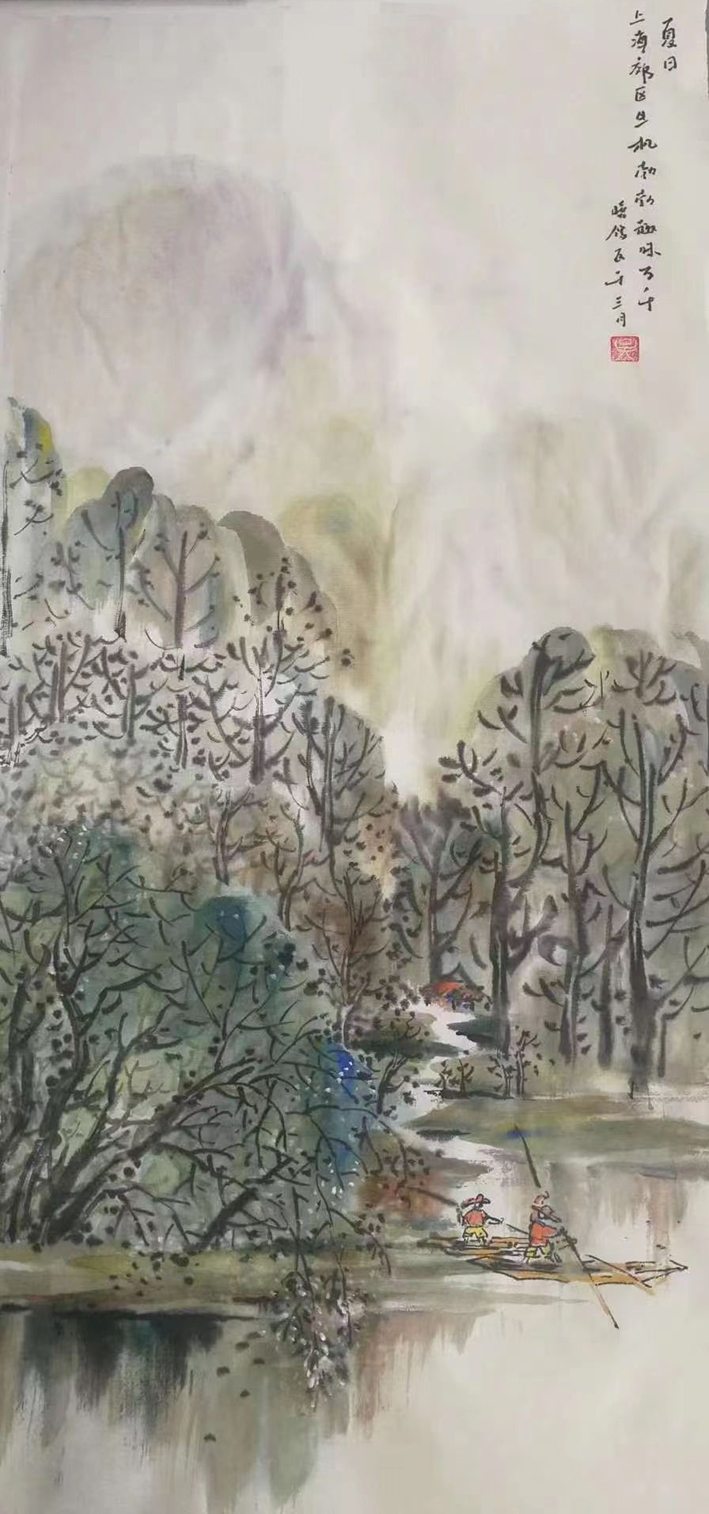 继观其山水画中,画中山水写意气象尤在,是谓远观可居可游,近观骨力洞达,且无论是笔墨的繁简,还是墨色的交融,在吴晓鸽女士的手中,其都是能够达到一种构意自然的表现境界!一幅山水所绘,是有奇石险峰之恢弘,更是有云水栝淡之盎然,民居屋舍坐落其间,蓑衣撑船忘却俗尘,如此画中情景,观之诚是可令人心神畅怀也!因此对于观赏者而言,吴晓鸽女士的众幅山水画中也早就不是简单的笔墨堆砌,而是一种可沁人心的写意造境,每一处都有性情之抒发,每一景都有清逸之流露,古风天然,其妙可品!