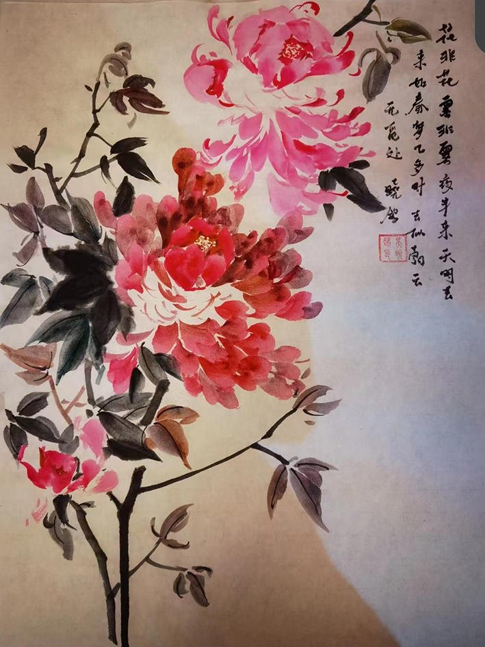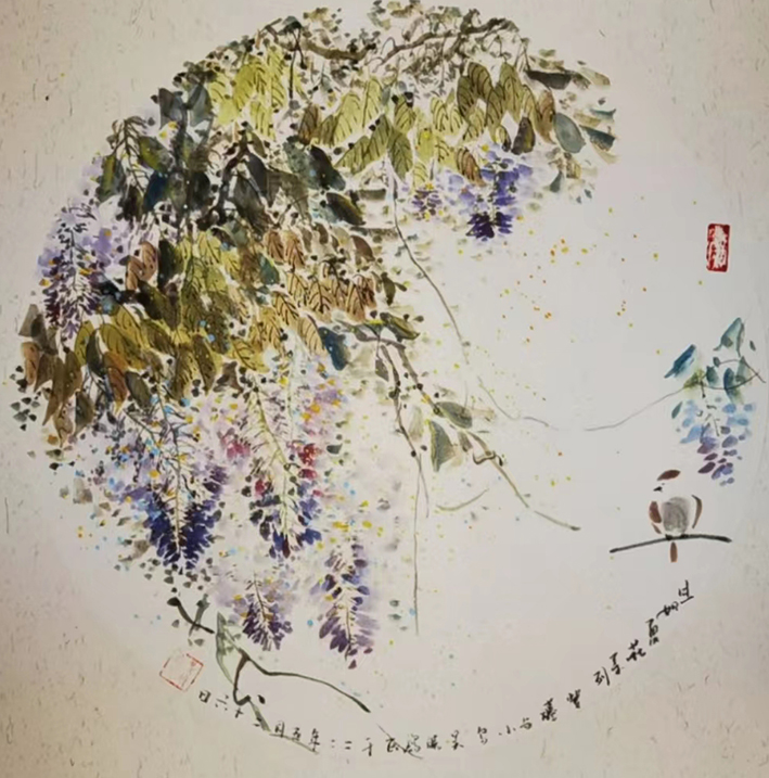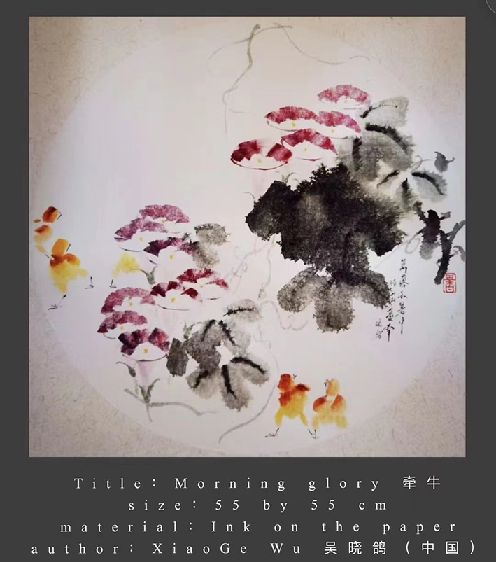 首观吴晓鸽女士的众幅花鸟作品,其画面是有兼涉于牡丹、紫藤、牵牛花等传统花卉题材,但相比于其他画家,吴晓鸽女士的写意气象则是有着更加不经意的情趣彰显,没有所谓的刻意矫饰,更没有死板的搬照自然,这完全就是一种经由览物所得的心迹交融,是谓取之于景而又蕴藉于心也,写意之情,可以尽抒!而在画面的墨色的赋予上,吴晓鸽女士也是有着很强的色感分寸,画面之中是很少用到单方面的浓艳色彩,取而代之的则是多方面的相互调和搭配,并以此来彰显其视觉对比性。也正因如此,其花鸟的布局结构也才会形成一定的层次质感,是谓墨不碍色,色不碍墨,点染烘托,惬意纵情!
