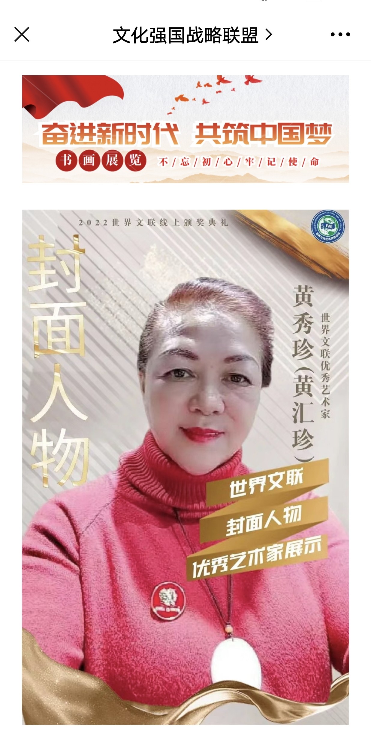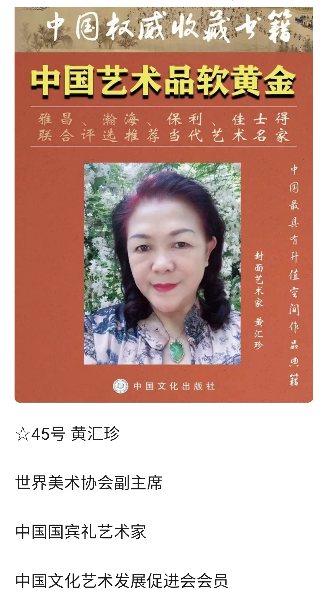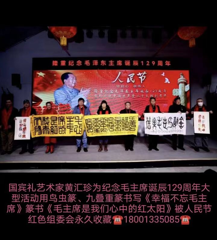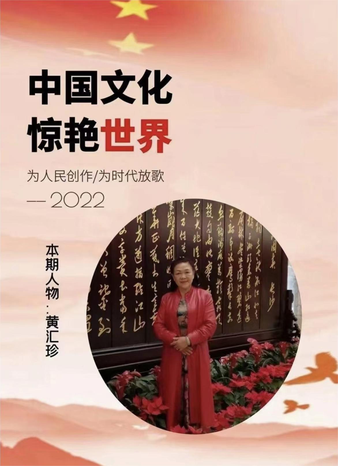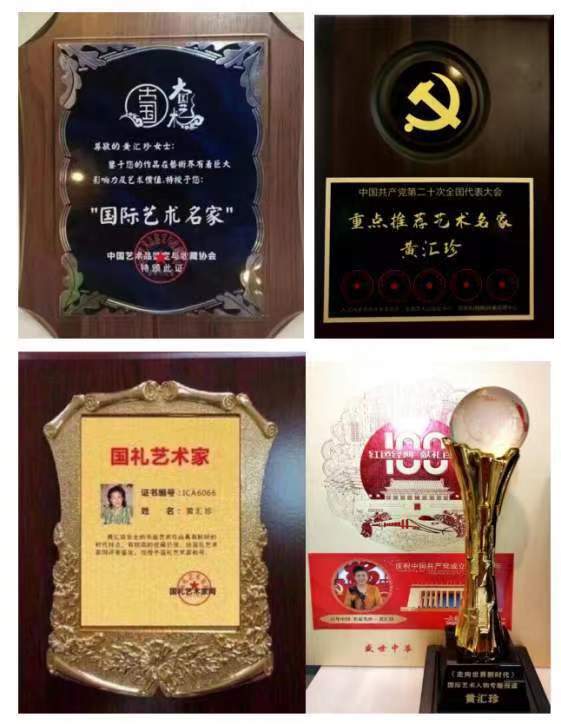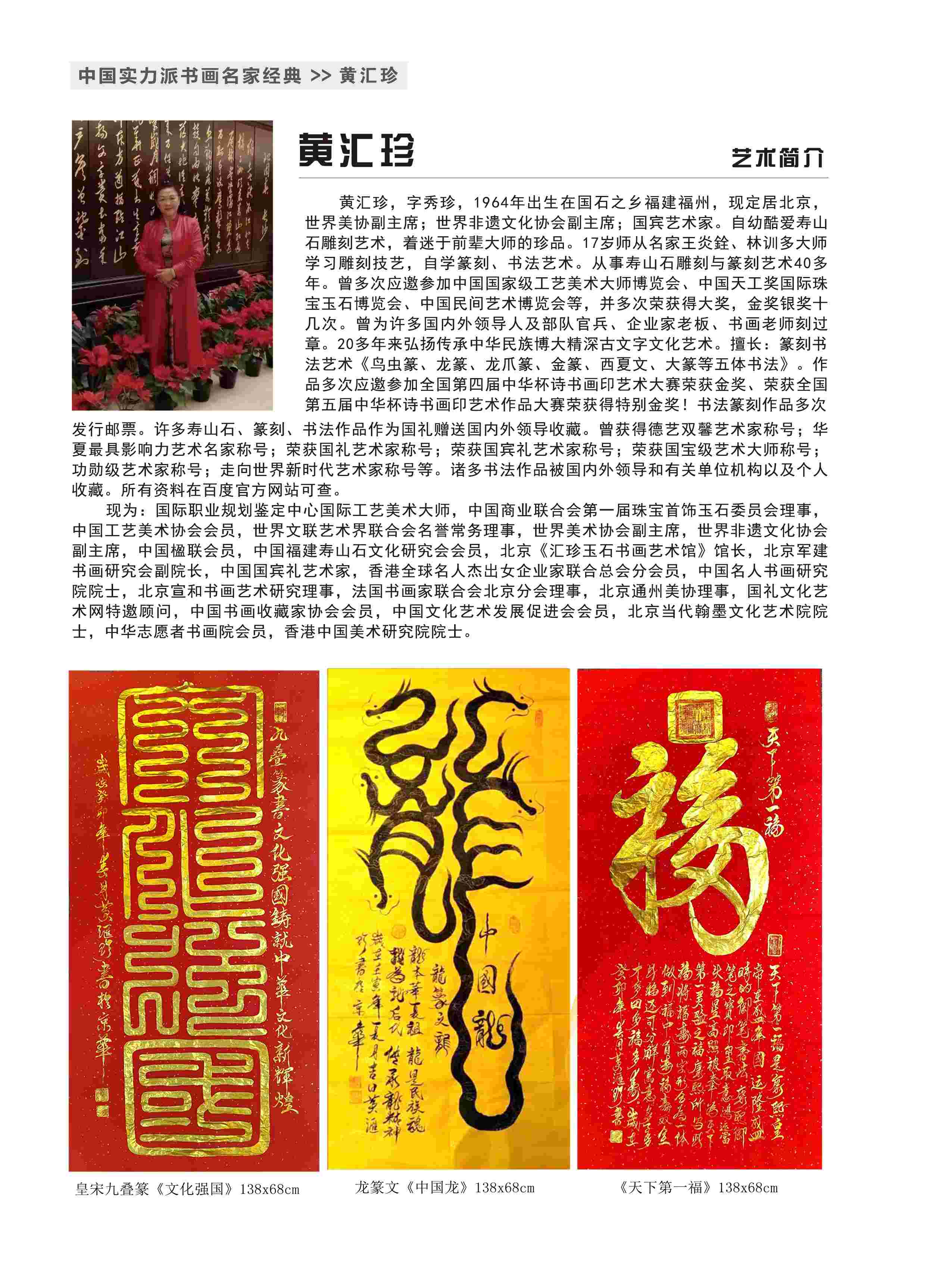 世界美协副主席;世界非遗文化协会副主席;国宾艺术家黄汇珍:(字秀珍)1964年出生在国石之乡福建福州,现定居北京。自幼酷爱寿山石雕刻艺术,着迷于前辈大师的珍品。17岁师从名家王炎銓、林训多大师学习雕刻技艺,自学篆刻、书法艺术,勤学苦练,博取众长,向前辈以及同仁学习。寿山石成为她能够激起一切情感、一切愿望的因素,她与石结下了不解之缘。弘扬中华民族传统文化艺术,从事寿山石雕刻与篆刻艺术40多年。曾多次应邀参加中国国家级工艺美术大师博览会、中国天工奖国际珠宝玉石博览会、中国民间艺术博览会等,并多次荣获得大奖,金奖银奖十几次。曾为许多国内外领导人及部队官兵、企业家老板、书画老师刻过章。20多年来弘扬传承中华民族博大精深古文字文化艺术。擅长:篆刻书法艺术《鸟虫篆、龙篆、龙爪篆、金篆、西夏文、大篆等五体书法》。在文化部鸟虫篆研究院王祥云院长支持指点下,不断提高自己书写能力。勤学苦练、博取众长,形成自己的风格。作品多次应邀参加全国第四届中华杯诗书画印艺术大赛荣获金奖、荣获全国第五届中华杯诗书画印艺术作品大赛荣获得特别金奖!书法篆刻作品在:民族强文化强:国家名片中国邮政发行邮票。在中国邮政:建党百年华诞献礼名家发行邮票。在红色经典、献礼百年:庆祝中国共产党成立百年名家名作—黄汇珍发行邮票;在魅力中国、闪耀世界!世界邮票上的艺术名家发行邮票。许多寿山石、篆刻、书法作品作为国礼赠送国内外领导收藏。诸多书法作品被国内外领导和有关单位机构以及个人收藏。曾获得德艺双馨艺术家称号;华夏最具影响力艺术名家称号;荣获国礼艺术家称号;荣获国宾礼艺术家称号;荣获国宝级艺术大师称号;功勋级艺术家称号;走向世界新时代艺术家称号等。书法作品编入:中国书画出版社:中国功勋艺术家画册、…中国文艺出版社:当代名家典藏画册;在献礼二十大永远跟党走新时代最美贡献者人物风采录画册,在中国文化出版社:中国权威收藏书籍中国艺术品软黄金雅昌瀚海保利佳士得联合评选推荐当代艺术名家黄汇珍中国最具有升值空间作品典籍发行个人专辑;在《中国近当代书画名家典藏》;在《国家收藏》当代书画名家名录画册出版发行。所有资料在百度官方网站可查。