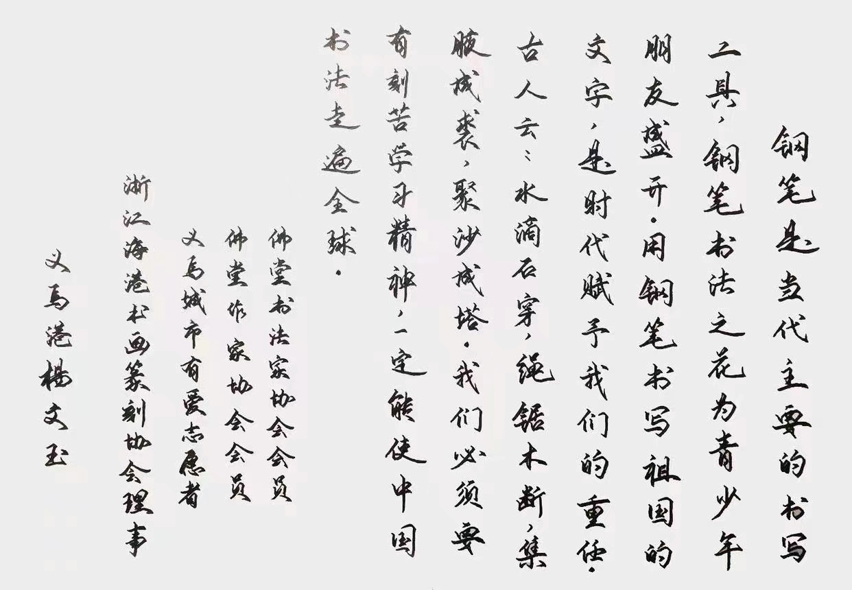 自幼研习书法,03年04年获得全国青少年书法比赛一等奖,2014年考入义乌港财务科工作至今,以把传统文化作为终生爱好,并继续发扬传承下去。