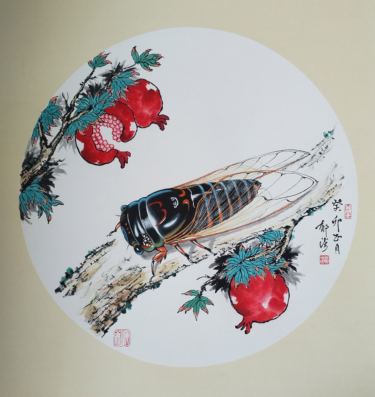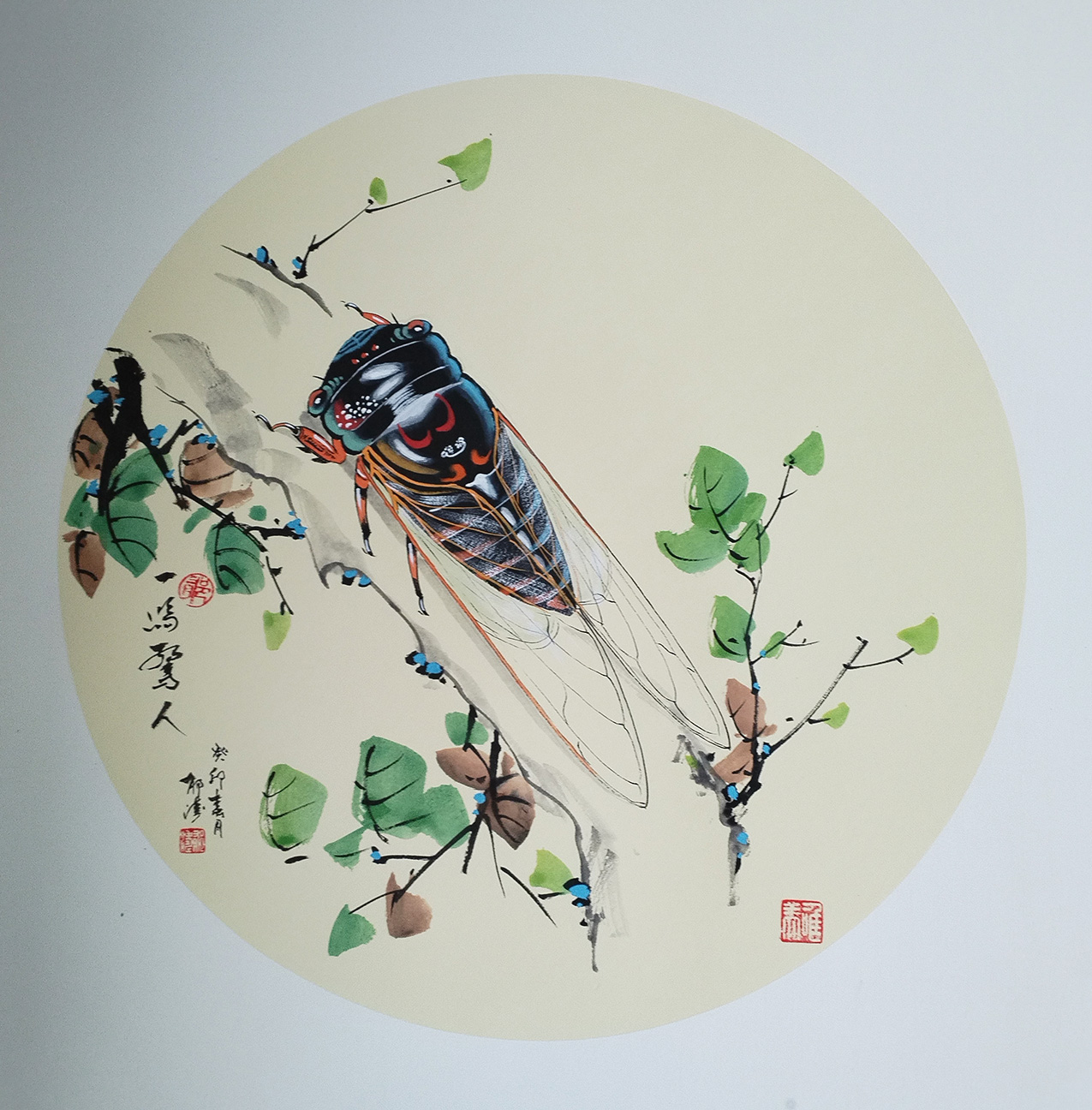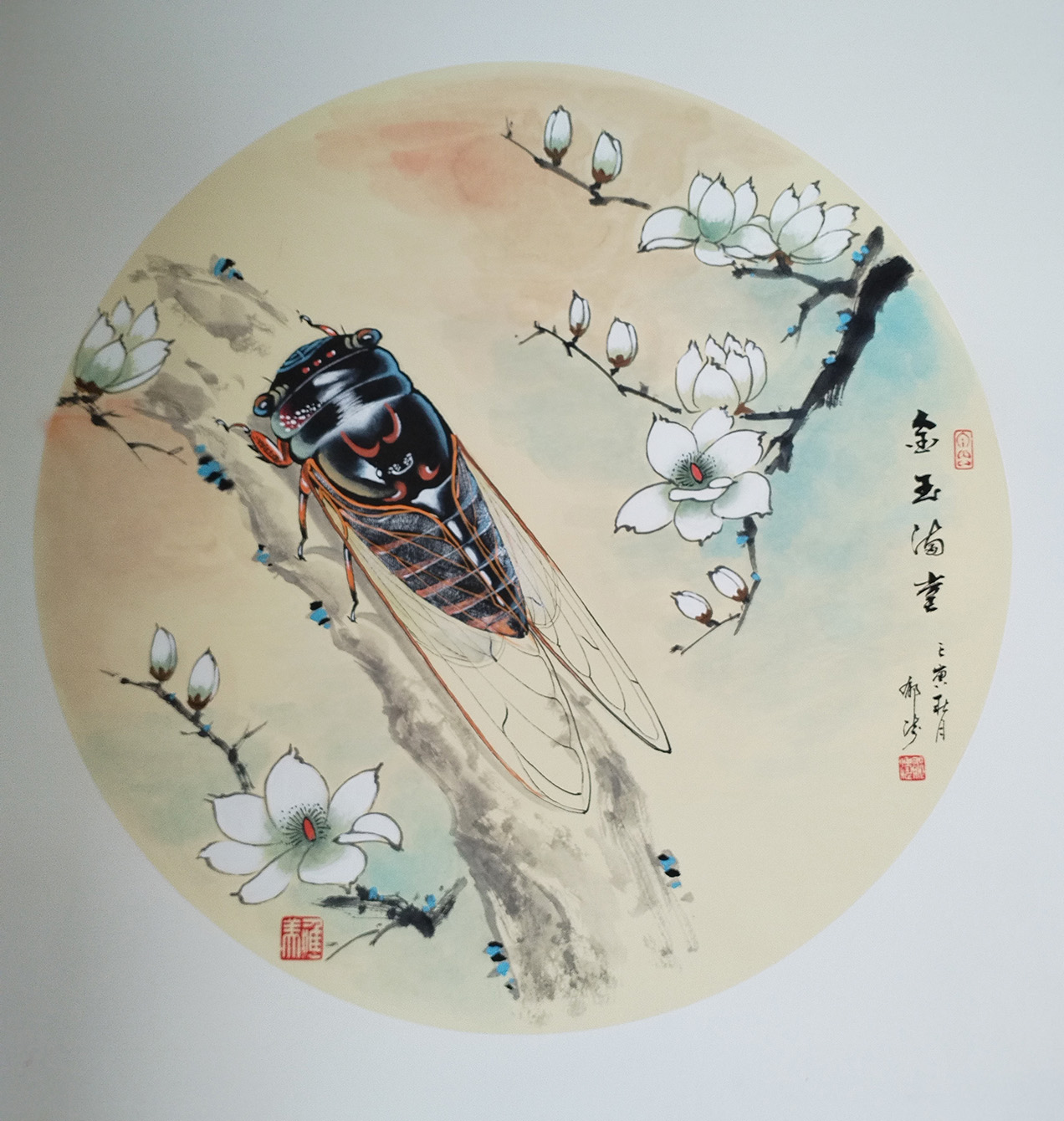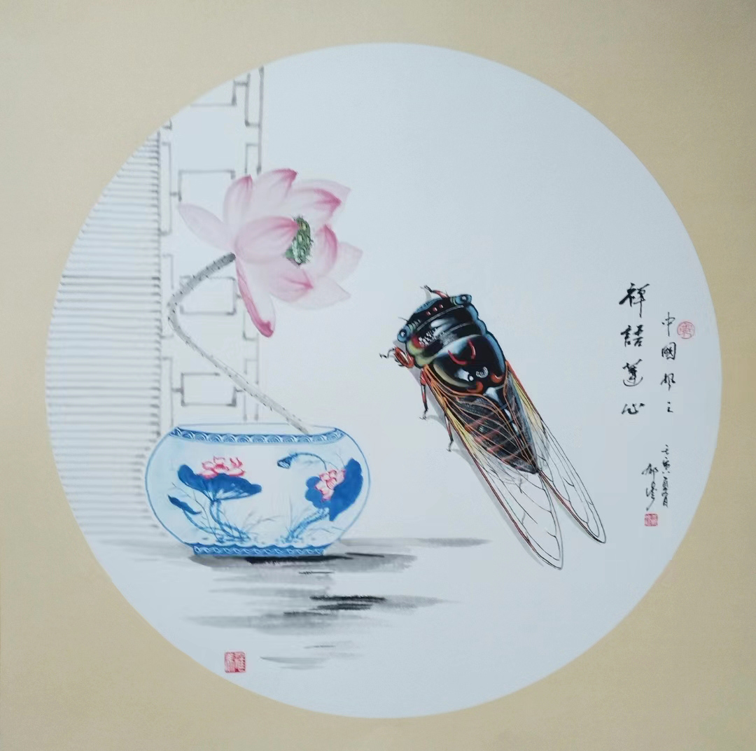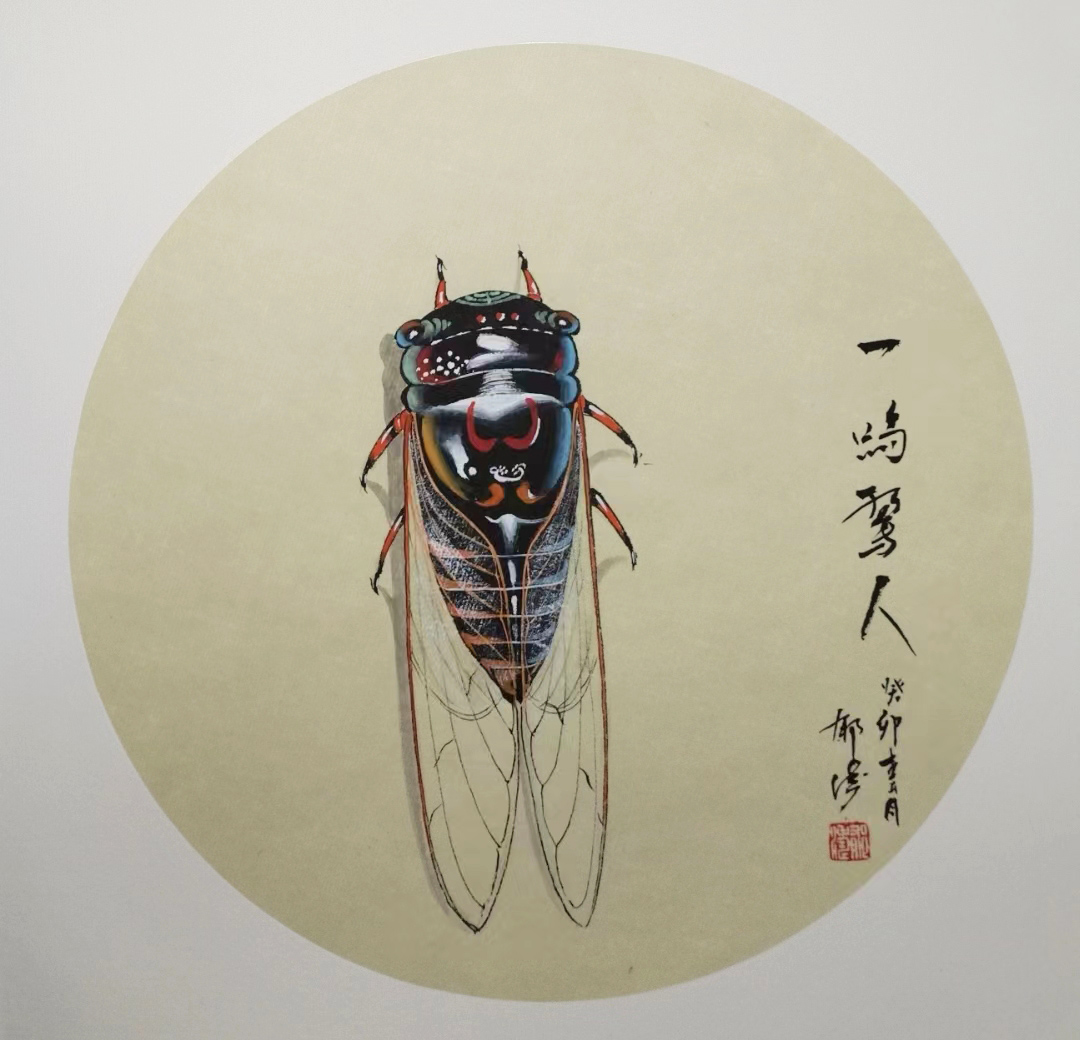 不同于大写意丹青的挥毫气象,工笔写虫的难度,是在于笔精墨妙的细微处理,即一笔一处皆是恰到好处,但笔墨倘若刻意矫饰,则就会很容易陷入匠俗感,死板无神,难以悦目。而作为一名实力深厚的绘虫名家,郁涛先生自然也是有明晰于此要论,故而其蝉画中笔墨,无论是工笔细点的特征构造,还是花卉意趣的盈动横生,都是能尽显于一种畅神的表现状态!工笔重视技法锤炼,形神造境清晰明快,而如此一幅幅可以寄情心源的小品画作,观之也真是空灵至极!文人底蕴,一目了然!
